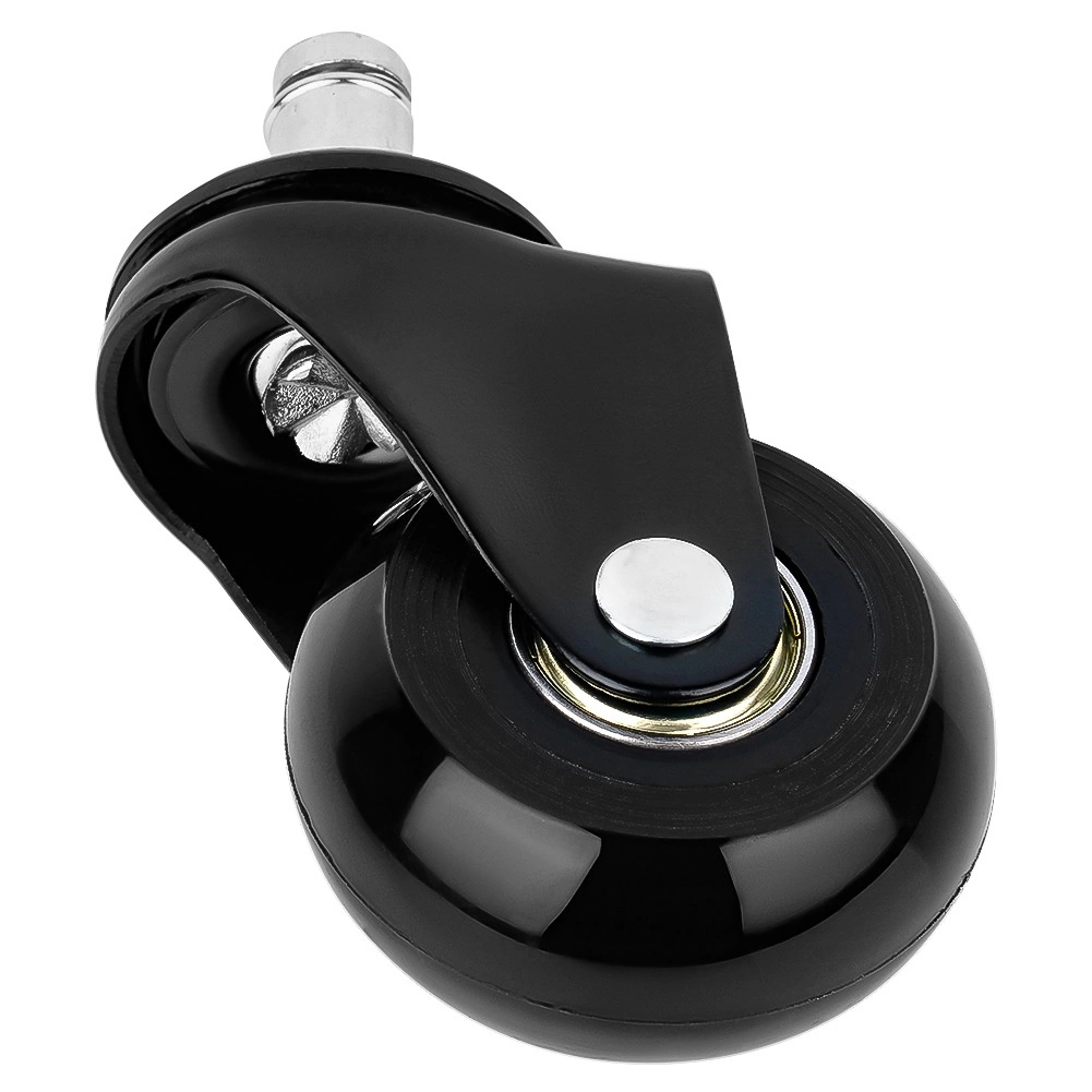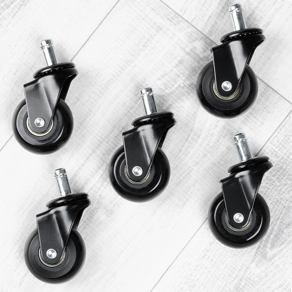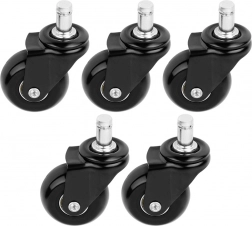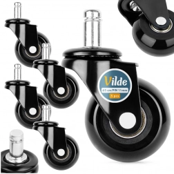 Installationen klares på et øjeblik — du skal blot trække de gamle hjul ud og klikke de nye i i den femarmede base. Den standard 11 mm tap giver bred kompatibilitet med de fleste kontorstole (ikke egnet til IKEA-stole). Ideel til træ, laminat, fliser og vinyl.