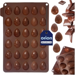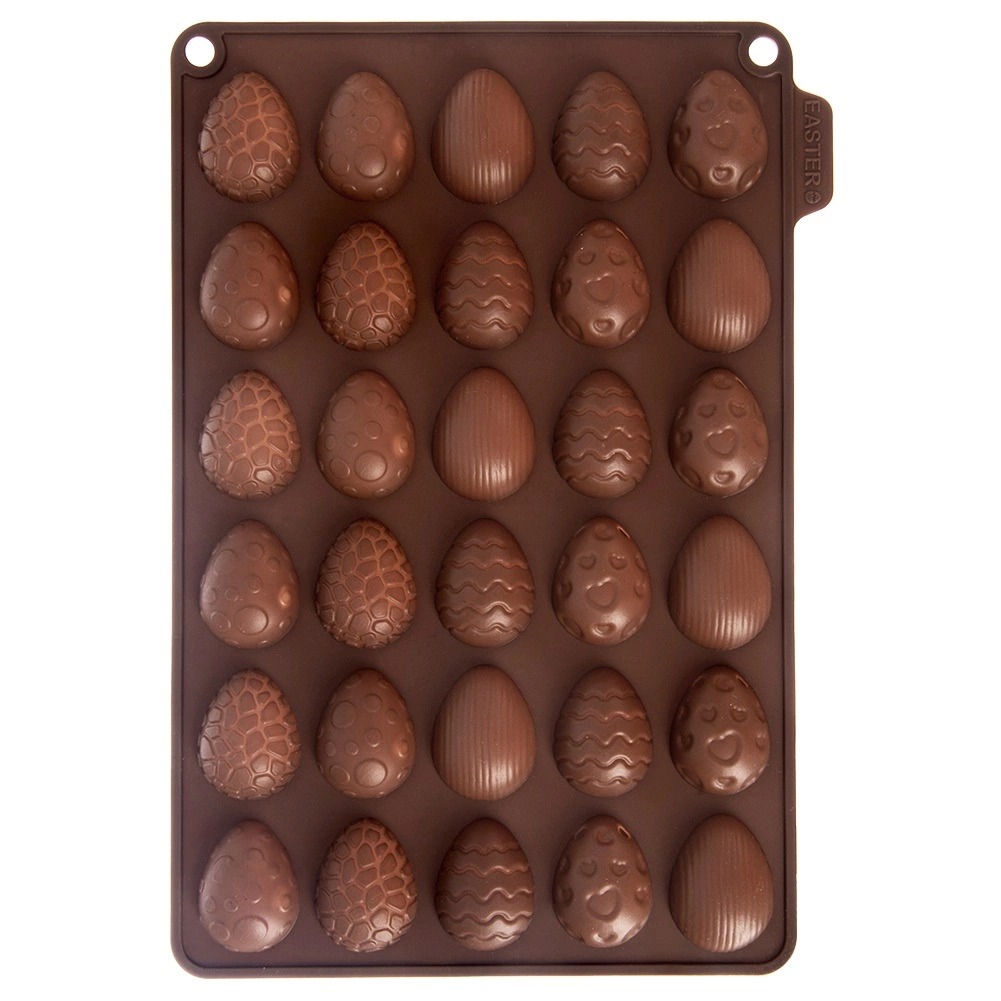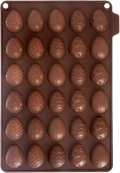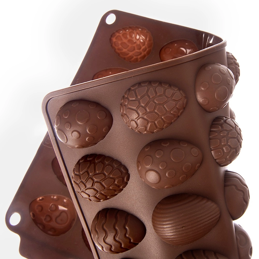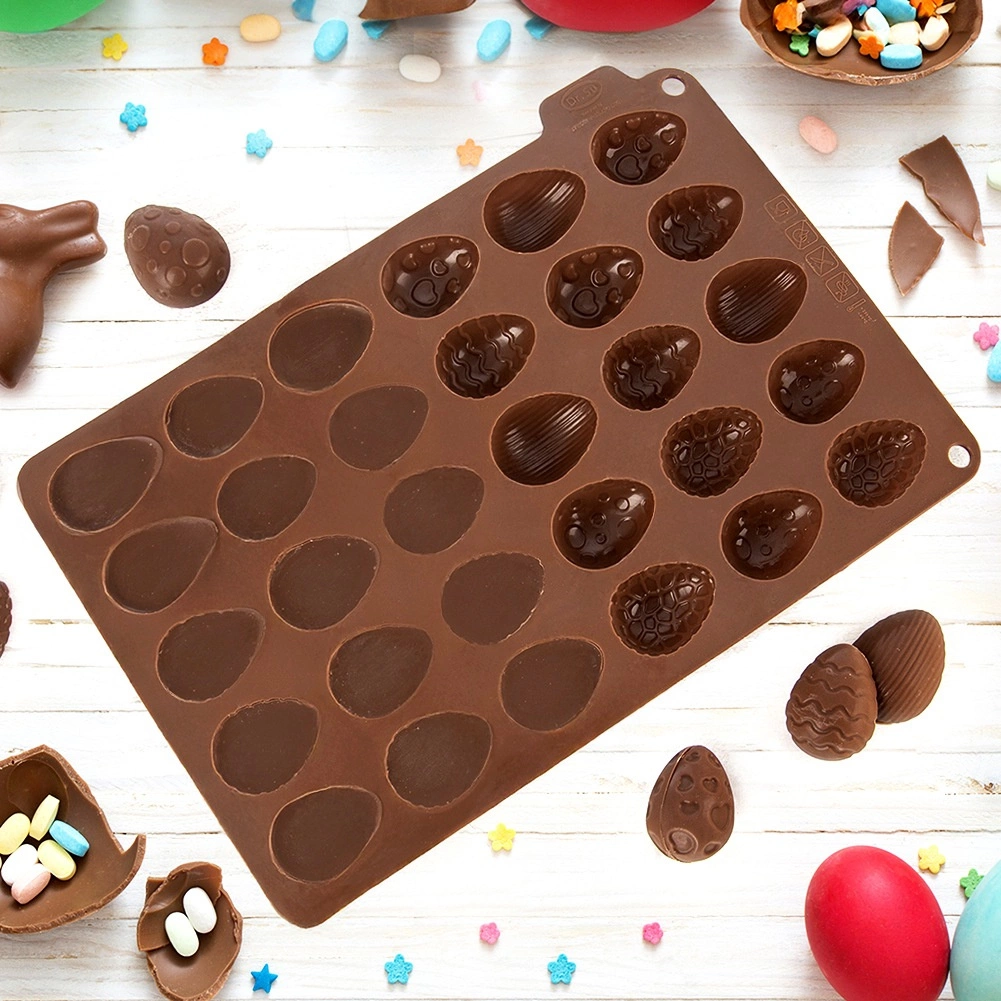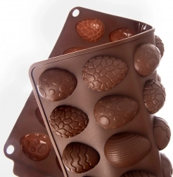 Denne kvalitetsform i silikone i brun farve gør det nemt at lave hjemmelavede praliner, chokolader og småt bagværk i æggeform. Takket være den non-stick overflade slippes de færdige produkter let uden behov for at smøre eller drysse. Formen er let, pladsbesparende og optager hverken lugt eller smag.