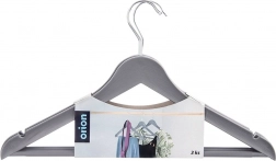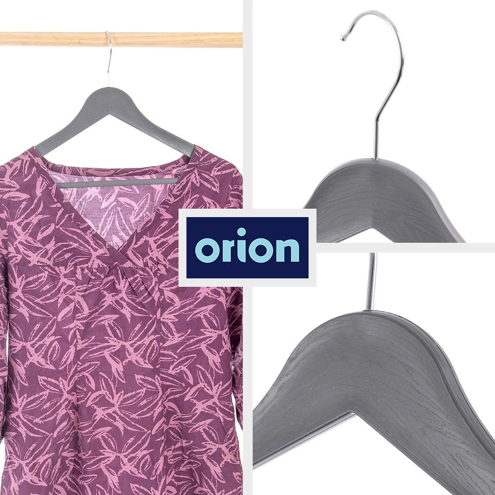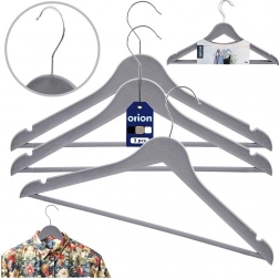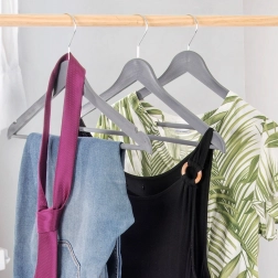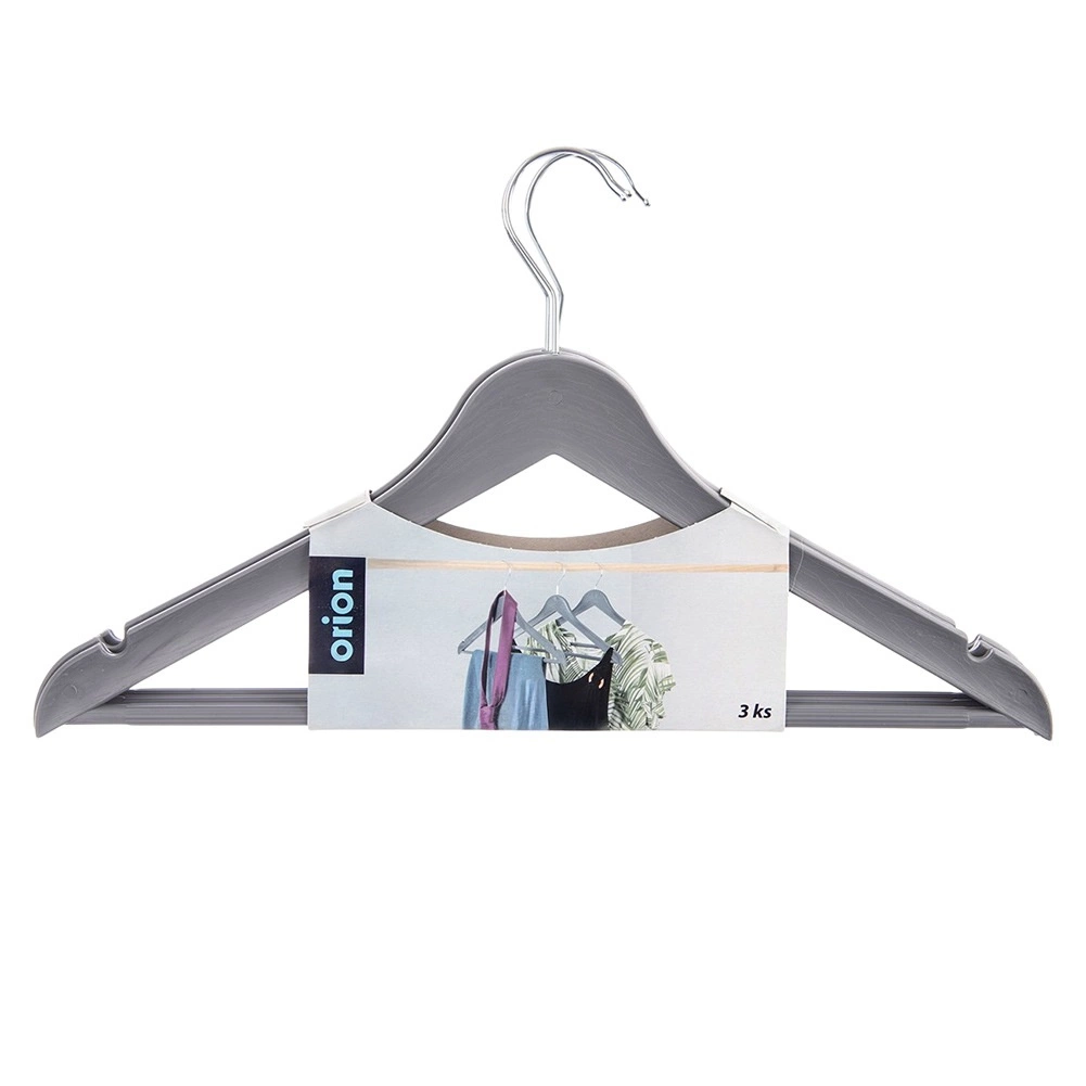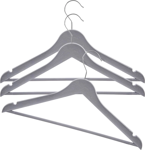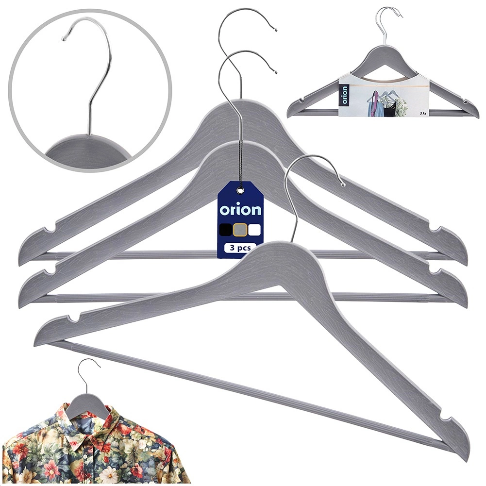 Sæt med 3 universelle bøjler i en moderne grå farve hjælper dig med at holde garderoben perfekt organiseret. Overfladen med trædekor og den drejelige metalkrog i sølvfarve giver både stil og funktion i ét. Bøjlerne egner sig til daglig brug i hjemmet såvel som i tøjbutikker.