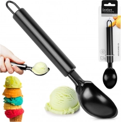 Denne robuste isske er lavet af kvalitetsrustfrit stål med en pulverlakeret mat sort overflade. Den dybe, afrundede hoveddel (bredde ca. 4,3 cm) former perfekt runde portioner uden anstrengelse, selv ved hårdere frosne desserter.