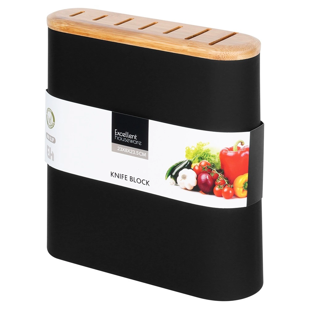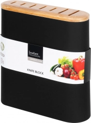Stilfuld og funktionel knivholder i størrelsen 23 × 8 × 23,5 cm, som sikrer overskuelig, sikker og hygiejnisk opbevaring af knive – fra stål over keramik til kombinationer. Den matte sorte krop med behagelig soft touch-overflade og øvre del i bambus med slots er et tidløst tilbehør til ethvert køkken.