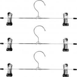 Opdag en praktisk løsning til garderobeorganisering: et sæt med tre robuste metalklædebøjler med glidende clips og beskyttende gummiindlæg. Takket være den justerbare bredde fastholder de sikkert forskellige typer tøj og hjælper med at forebygge krøl. Det minimalistiske design i sølv passer ind i enhver garderobe.
