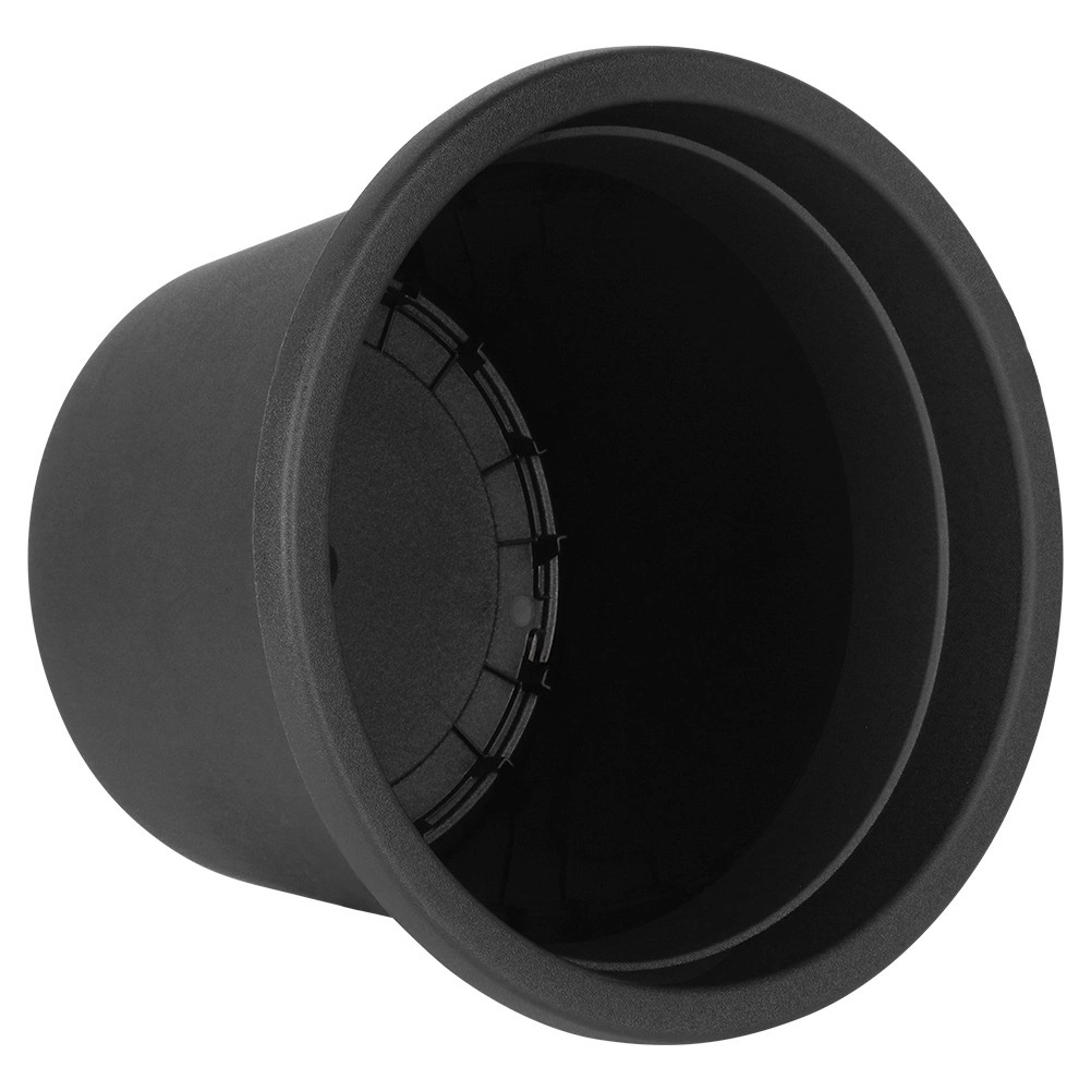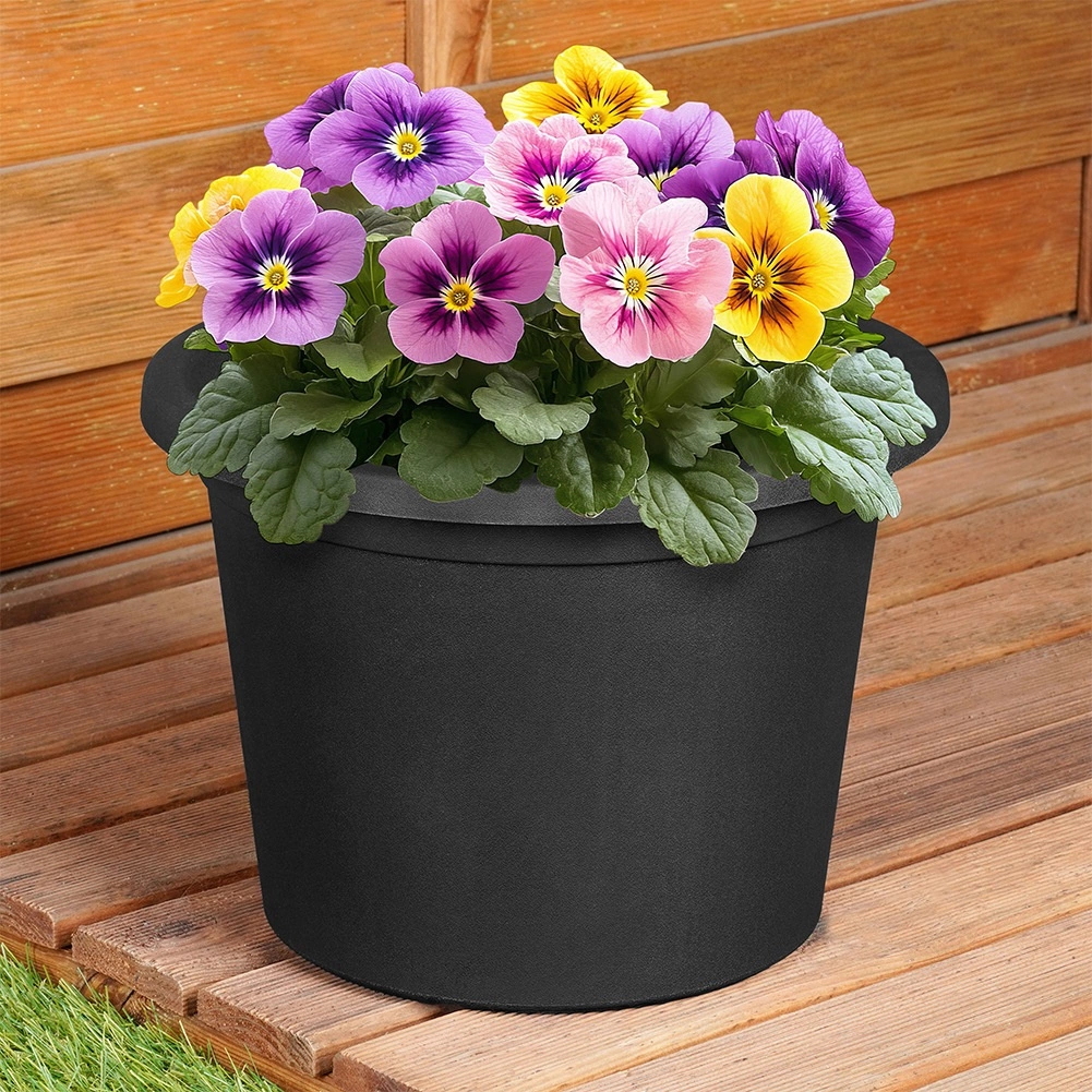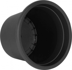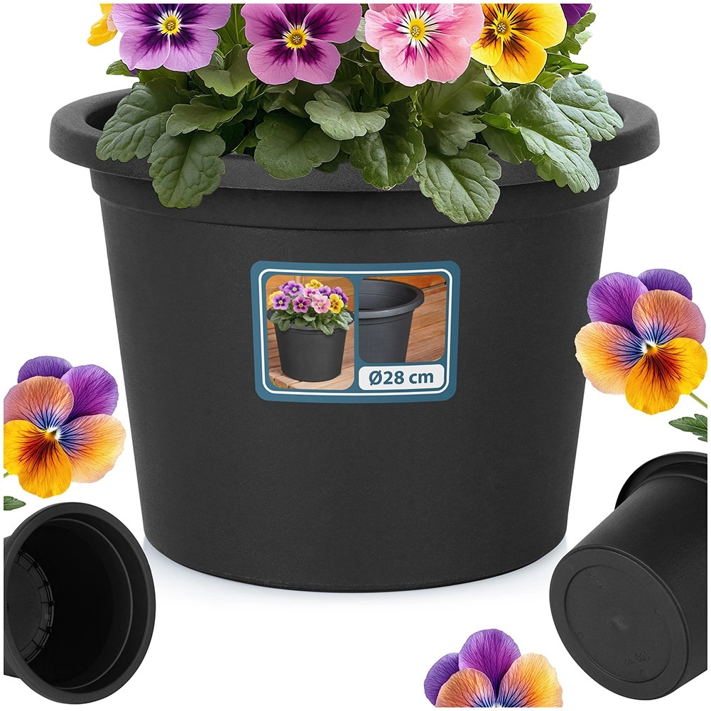 Sort rund krukke med en diameter på 27,5 cm og en højde på 19,5 cm er et ideelt valg til udendørs brug hele året. Den giver god plads til planternes vækst og virker elegant og stabil takket være den solide kant og de aftagende sider. Velegnet som selvstændig krukke eller dekorativ skjuler til indsatte beholdere.