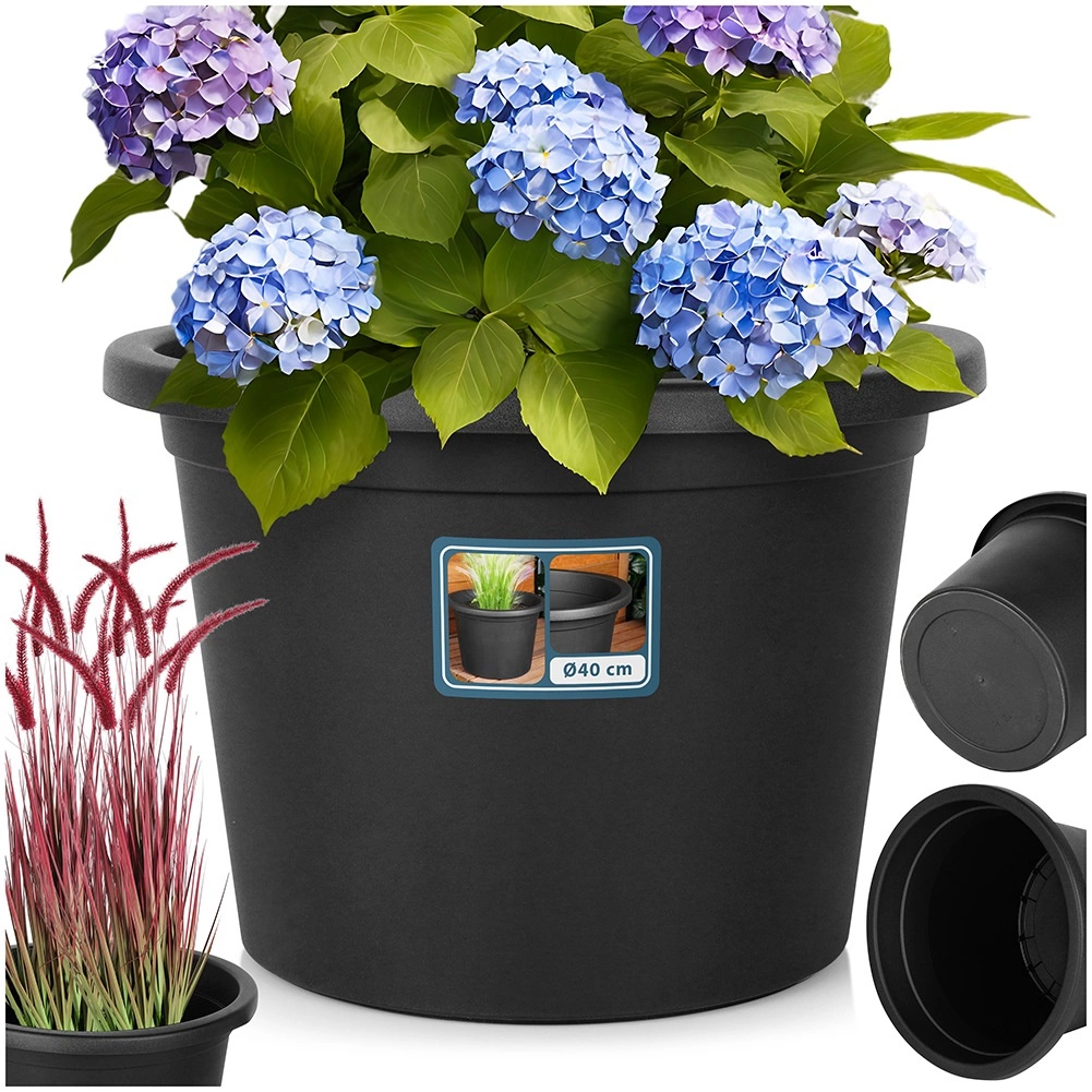 Denne store havekrukke med klassisk rund form er perfekt til plantning af prydgræsser, blomster og mindre buske. Takket være den robuste og lette konstruktion er den nem at håndtere, og det sorte design virker elegant i enhver udendørsindretning.