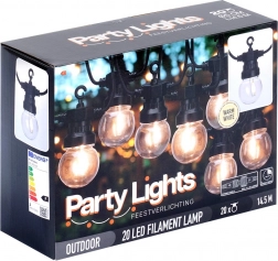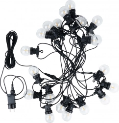 Lyskæden er netdrevet og takket være IP44-beskyttelsen modstår den almindelige vejrforhold. Den lange tilledning på 5 m gør det nemt at nå stikkontakten, den oplyste del måler 9,5 m, og den samlede længde er 14,5 m. Den indbyggede timer sørger for automatisk slukning efter 6 timer og tænding igen efter 18 timer.