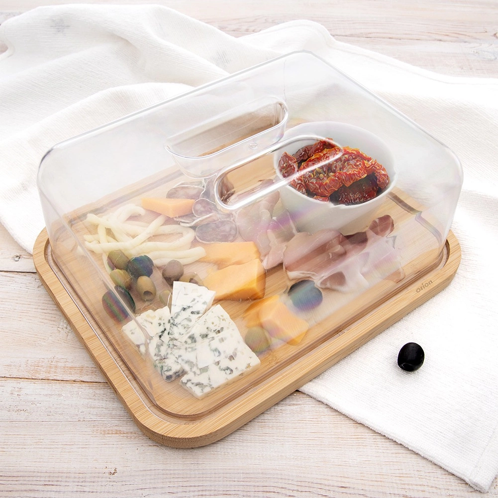 Bambus er holdbart, hygiejnisk og skånsomt mod naturen, absorberer ikke lugte og tørrer hurtigt. Rundt om brættet er der en praktisk rille til stabil placering af låget, som giver god tætning og beskytter mod udtørring og insekter – ideelt til servering på terrasse eller i haven.
