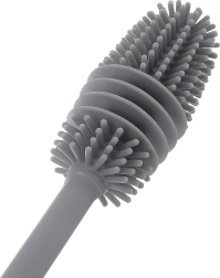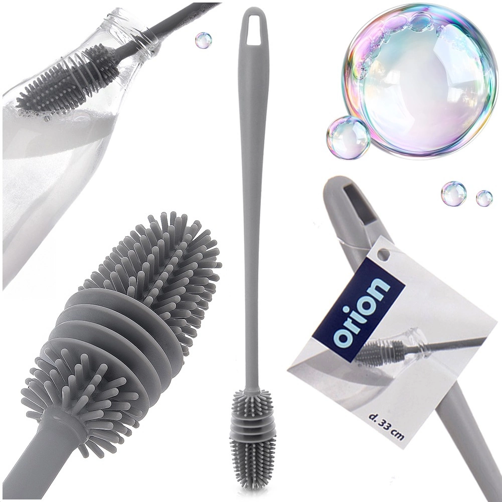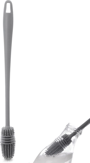 Praktisk silikonebørste til flasker og smalle beholdere med en længde på 32,5 cm og et børstehoved med en diameter på 3 cm. Takket være det lange håndtag og de tætte silikonebørster når den nemt ind i svært tilgængelige områder, fjerner effektivt belægninger og snavs og er skånsom mod overflader. Den holdbare, hygiejniske silikone absorberer hverken lugte eller fugt, og børsten kan tåle opvaskemaskine.