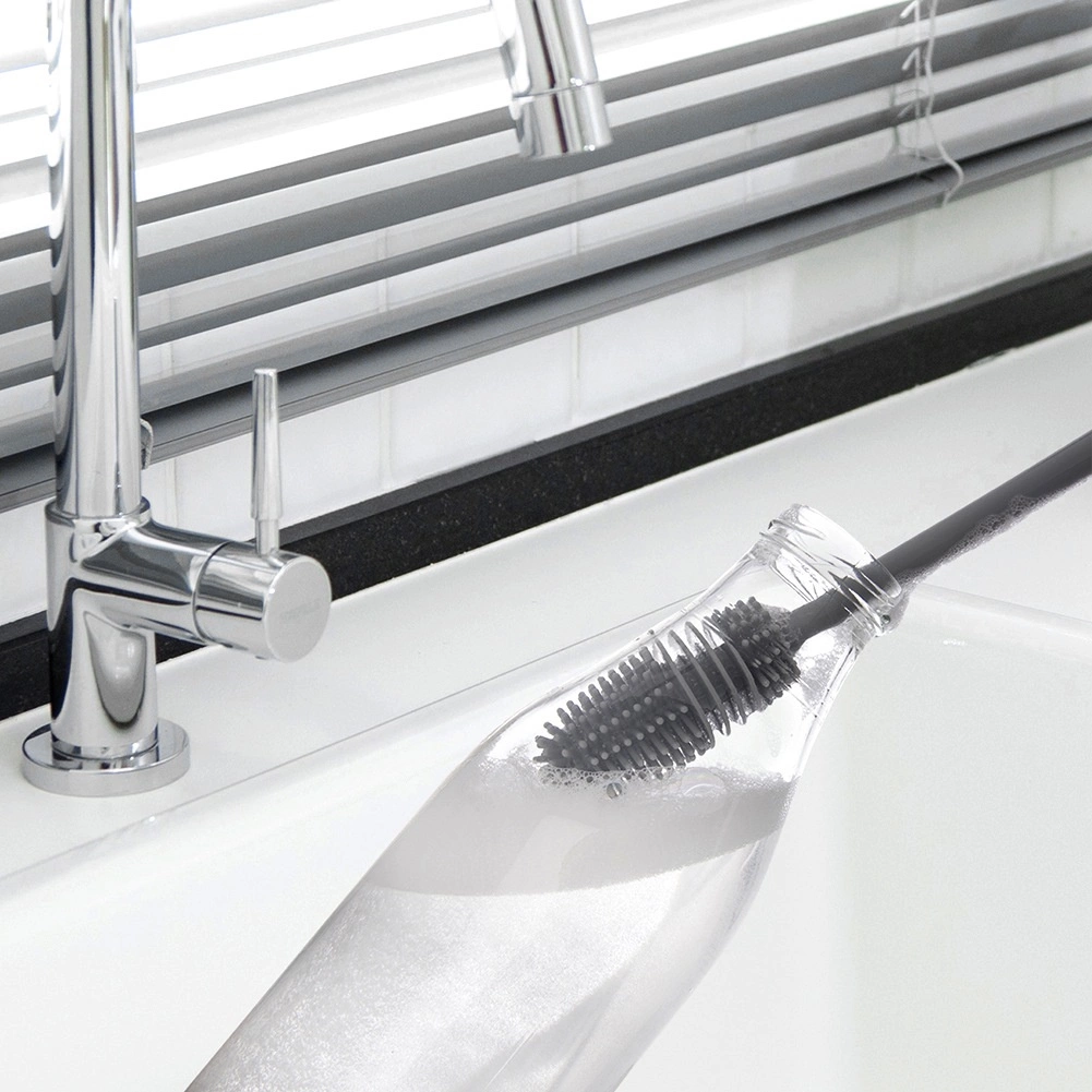 Silikoneflaskebørsten er ideel til rengøring af flasker, glas, karafler, vaser og sutteflasker. Det lange håndtag og det slanke børstehoved gør det nemt at rengøre helt ned til bunden selv i meget smalle beholdere. Silikonebørsterne er fleksible, holdbare og samtidig blide, så de rengør effektivt uden at ridse.