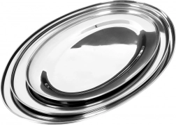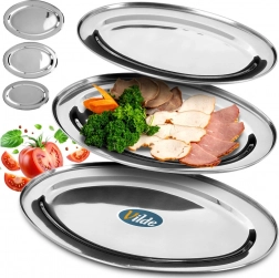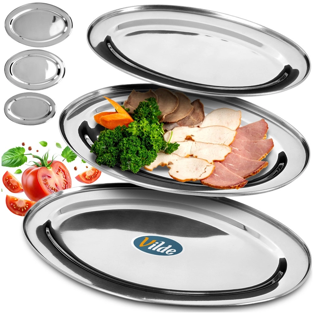 Sæt med 3 ovale serveringsfade i kvalitets rustfrit stål giver en alsidig løsning til både hverdags- og festservering. Den blanke overflade tilfører bordet et elegant udtryk, mens den forhøjede kant hjælper med at holde retter og safter sikkert på plads.