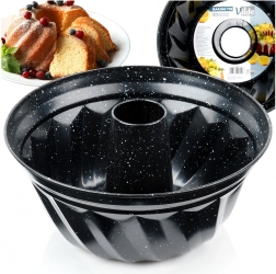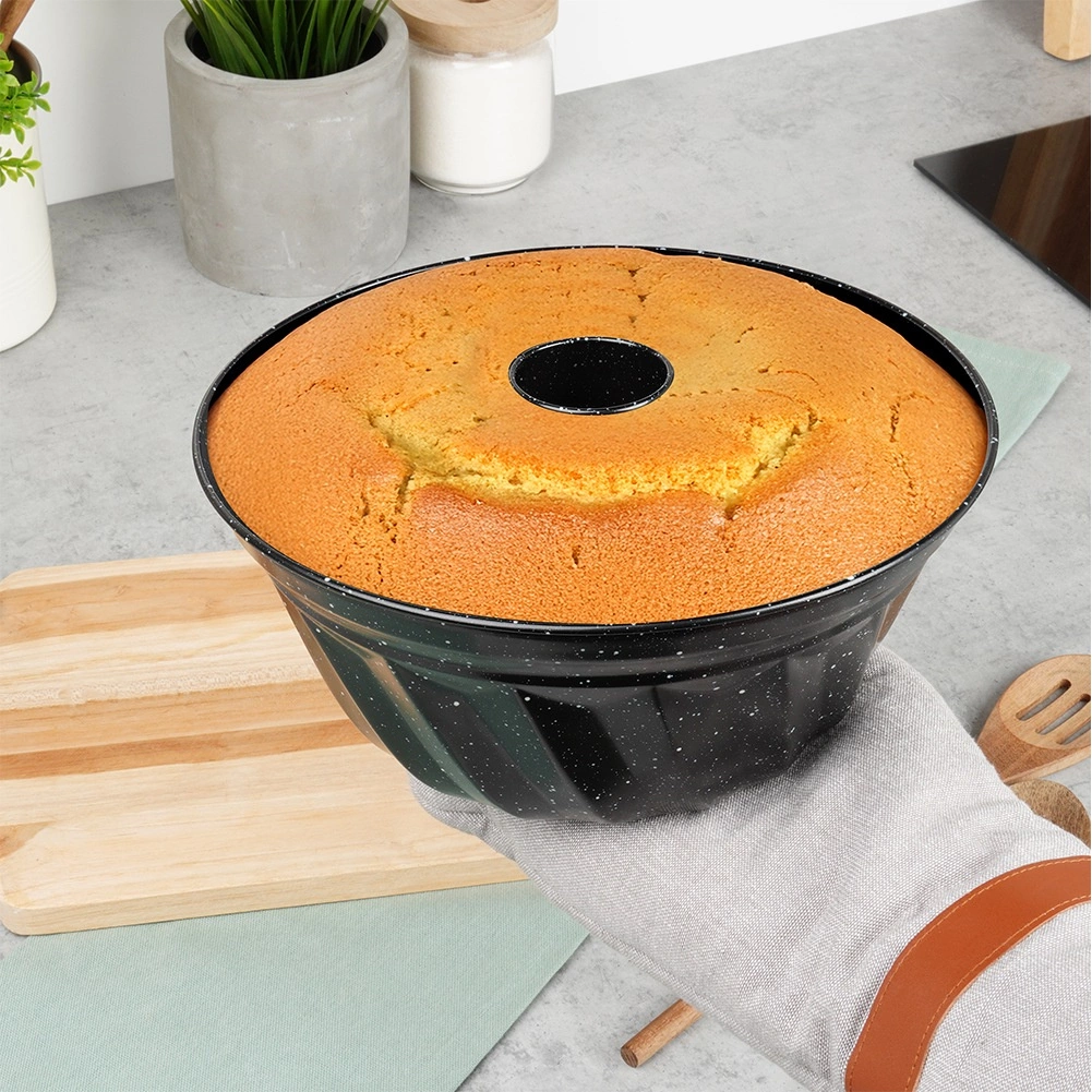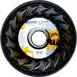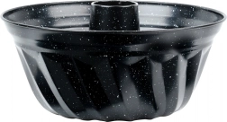 Praktisk kringlekageform med skorsten, diameter 24,5 cm og højde 12 cm, fremstillet af robust kulstofstål med granit non-stick belægning. Sikrer jævn bagning, nem udløsning og en dekorativ form på kagen. Velegnet til gas- og elovne op til 230 °C.
