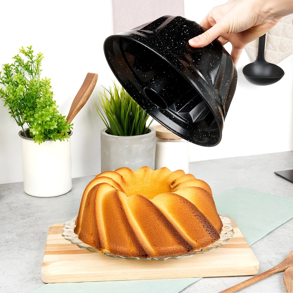Denne kringlekageform med skorsten er et pålideligt valg til både hverdagsbagning og festlige desserter. Takket være den granitbaserede non-stick overflade hænger dejen ikke fast, og kagen kan nemt tages ud uden at beskadige de dekorative riller. Det solide kulstofstål leder varmen effektivt og fremmer jævn gennembagning af både midte og kanter.
