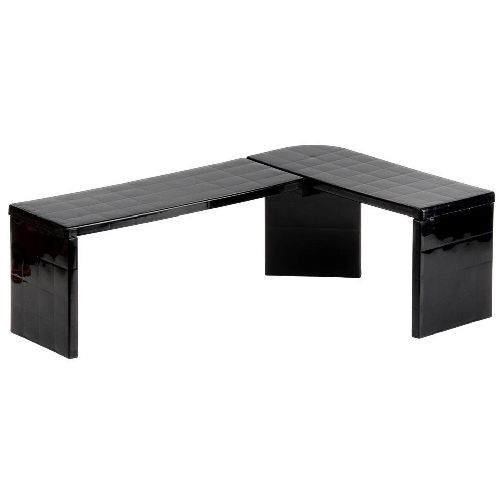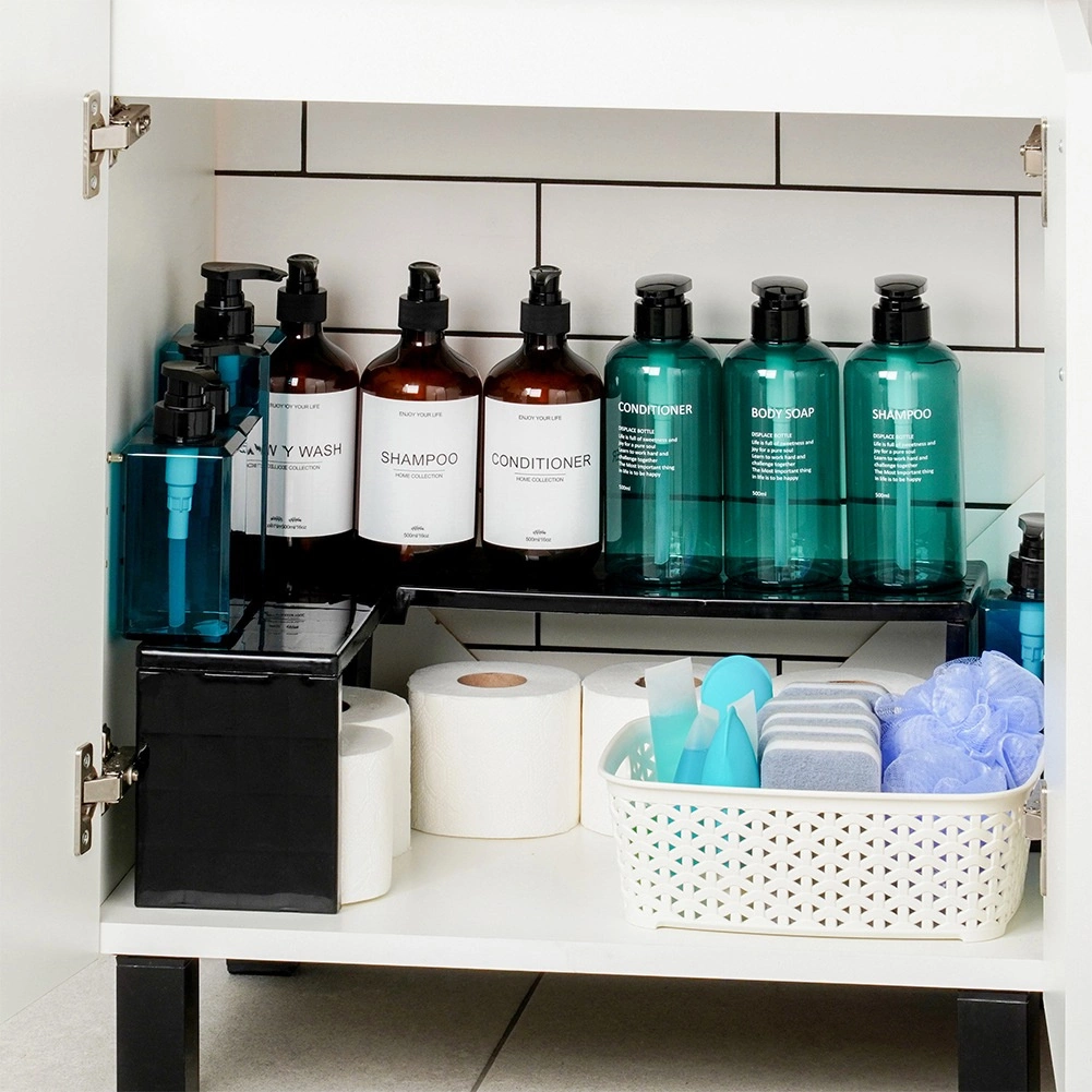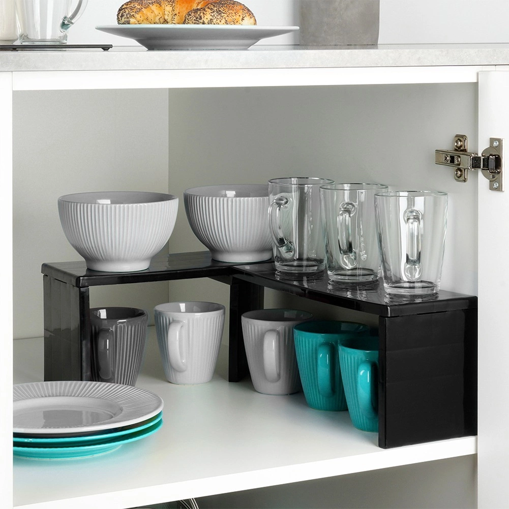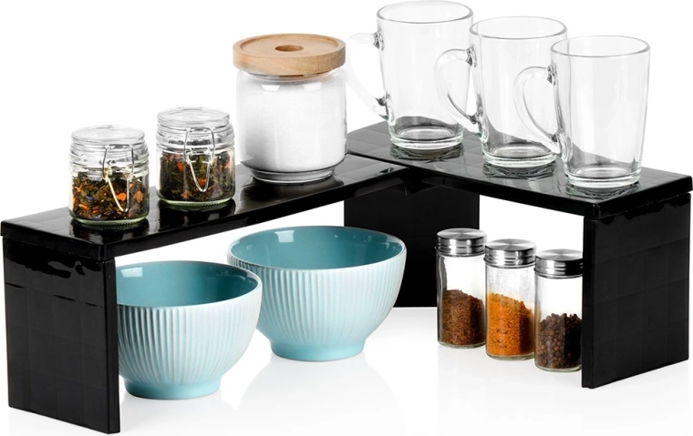 Praktisk hjørne-køkkenhylde i holdbar plast hjælper med at holde orden og udnytte pladsen bedre på køkkenbordet og i skabe. Den kan bruges som hjørnevariant eller langsgående variant, så du skaber to niveauer af opbevaringsplads til krydderier, krus, skåle eller dåser. Den stabile konstruktion i elegant sort passer til køkken, spisekammer, badeværelse og kontor.