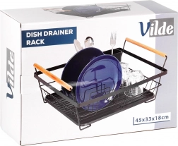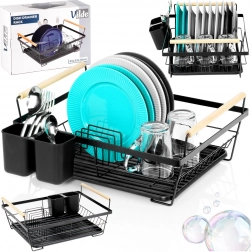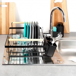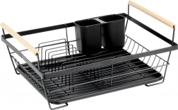 Det elegante sorte opvaskestativ kombinerer en solid metalkonstruktion med praktisk organisering af tallerkener, glas og bestik. Den udtagelige drypbakke opfanger vandet sikkert og holder køkkenbordet fri for våde pletter. To træhåndtag gør det let at bære, mens det tidløse design passer til både moderne og klassiske køkkener.