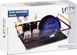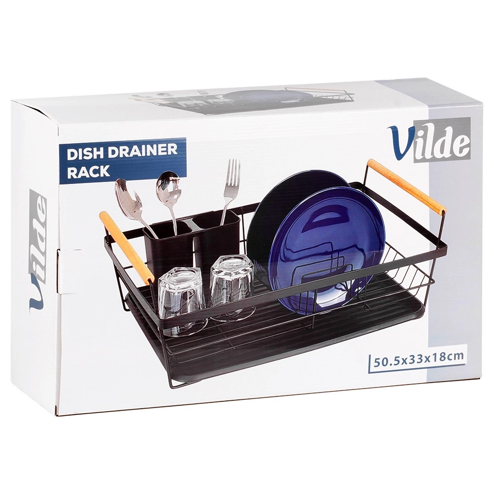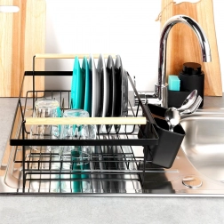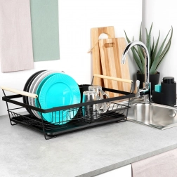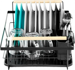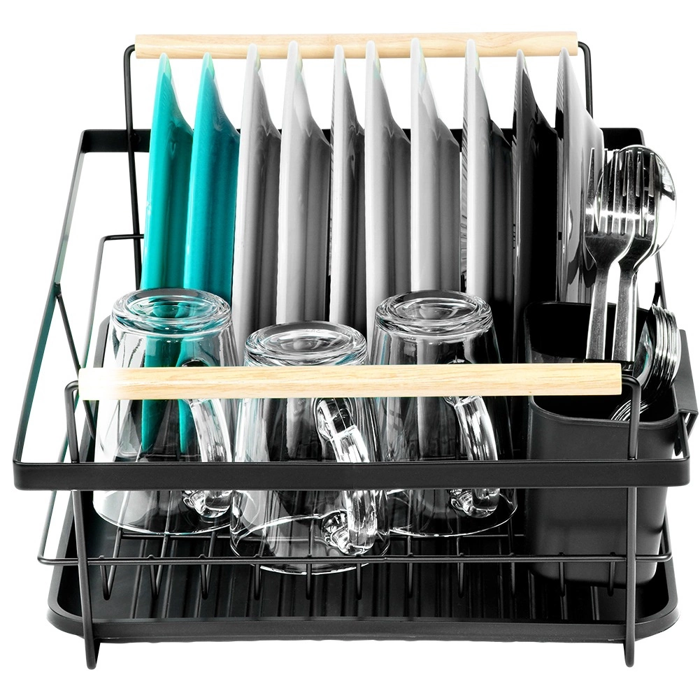 Hold bordpladen tør og servicen pænt organiseret. Dette rummelige opvaskestativ i holdbart rustfrit metal i sort tilbyder riller til tallerkener, plads til glas og skåle samt en aftagelig bestikkurv, der kan hænges både indvendigt og udvendigt. Den integrerede aftagelige drypbakke opsamler vand og gør vedligeholdelsen lettere.