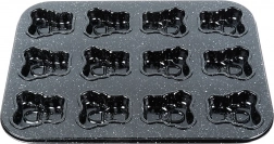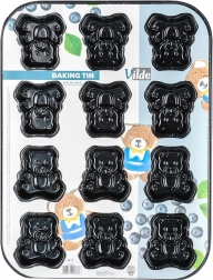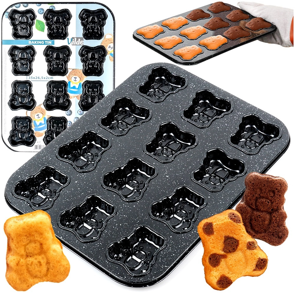 Bag legende småkager eller mini-muffins med flotte detaljer takket være formen i kvalitets-kulstofstål med granit non‑stick belægning. Formen måler 35 × 26,5 × 2 cm og rummer 12 portioner, hver i bamseform på ca. 6,5 × 6 cm. Materialet fordeler varmen jævnt, så dine lækkerier bliver gennemtilberedte og nemme at få ud.