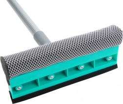 Den netdækkede svamp løsner snavs, og gummilisten fjerner vandet perfekt uden striber – alt i ét kompakt hoved.