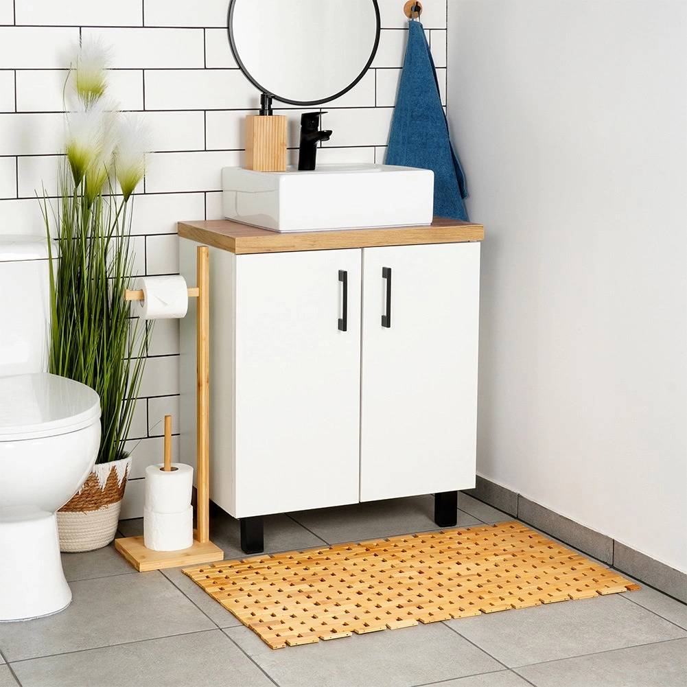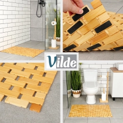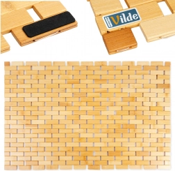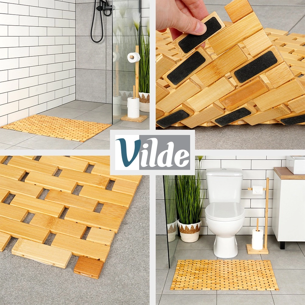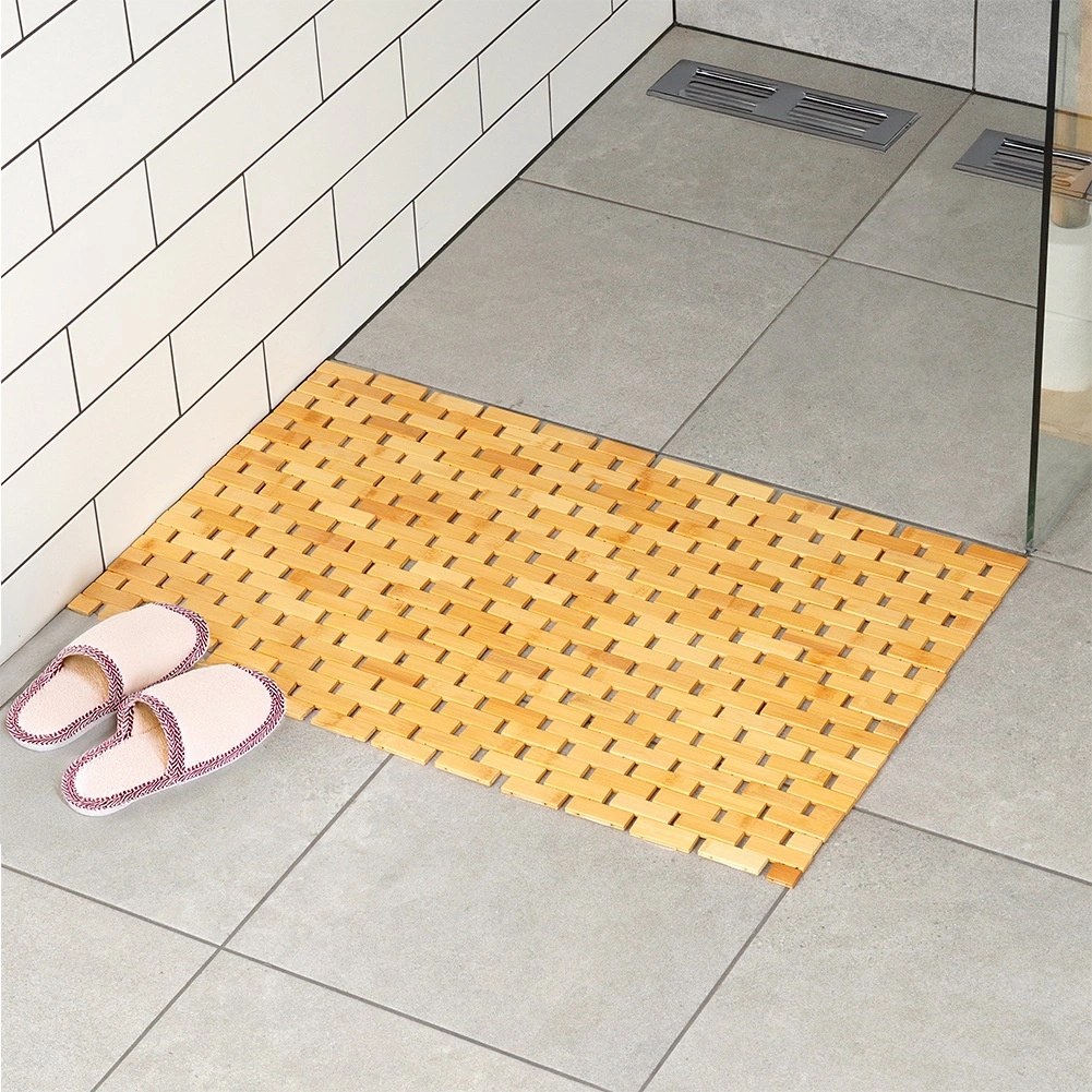 Denne stilfulde bambusmåtte til badeværelset kombinerer et naturligt udtryk med praktiske egenskaber. Bambuslameller med ventilationsmellemrum hjælper vandet med at løbe hurtigt af og tørre, så overfladen forbliver hygiejnisk og behagelig at røre ved. Det tidløse design passer nemt ind i både moderne og klassiske badeværelser.