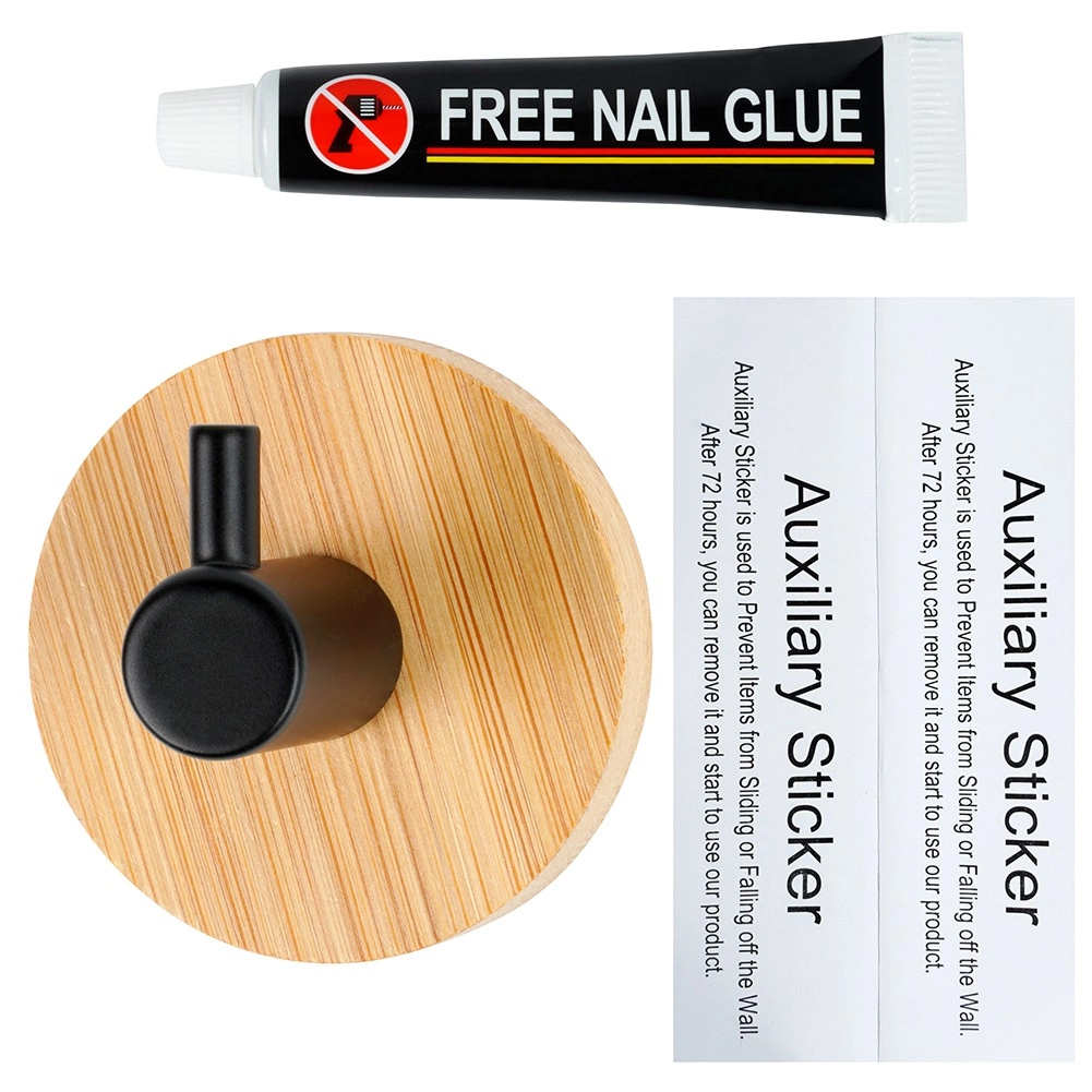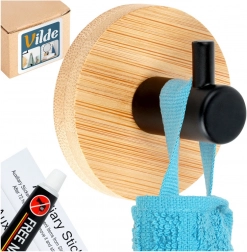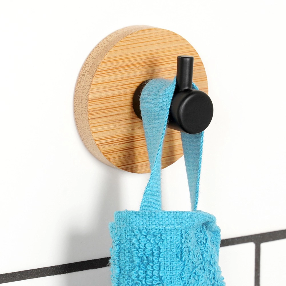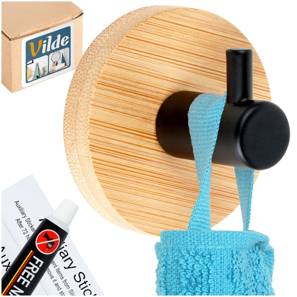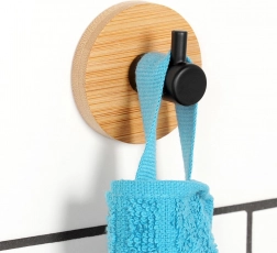 Elegant krog med rund bambusplade og mat sort metalstift, der passer til moderne såvel som naturlige interiører. Giver et praktisk sted til at hænge håndklæder, tøj eller tasker uden at du behøver at bore i væggen. Takket være materialer af høj kvalitet er den holdbar og pålidelig i længden.