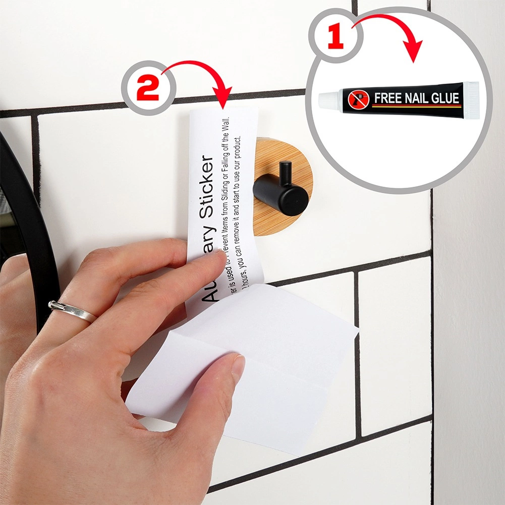 Installationen er hurtig og ren: krogen fastgøres med den medfølgende lim og hjælpestrips. For det bedste resultat rengør og affedt overfladen grundigt før montering, og lad limen hærde i ca. 72 timer før første belastning.