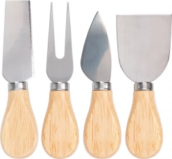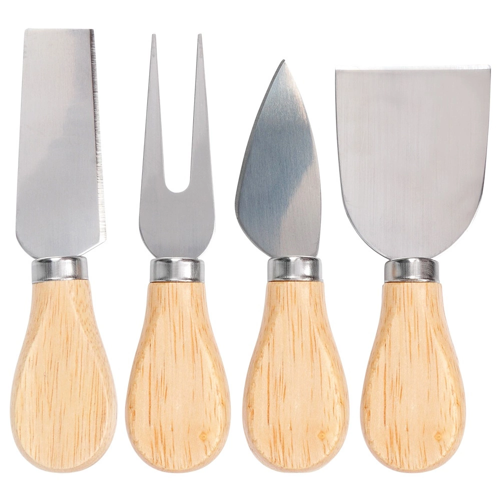 Komplet sæt med to knive, en spartel og en gaffel til skæring, opdeling og servering af forskellige ostetyper.
