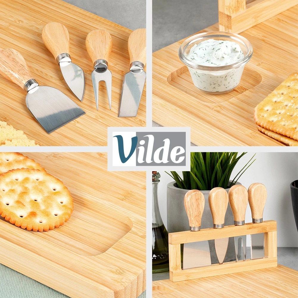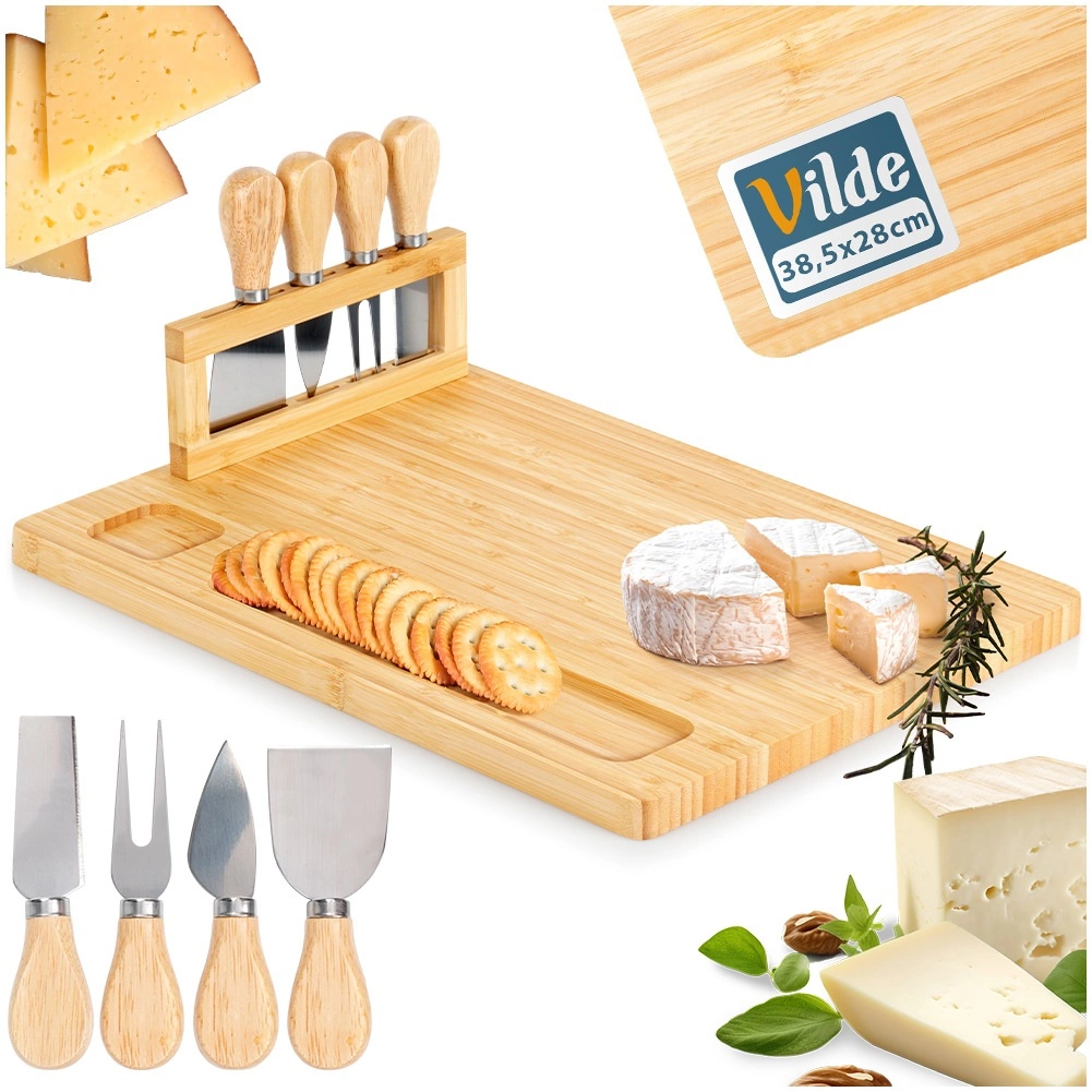 Stilfuldt sæt til ostelskere: bambus skærebræt med integreret holder og fire værktøjer i rustfrit stål. Ideelt til skæring, opdeling og servering af oste, pålæg og snacks. Naturlig bambus er modstandsdygtig over for fugt, tørrer hurtigt og absorberer ikke lugte. Perfekt til hjemmebrug, fester og vin-aftener.