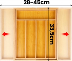Organisér dit køkken hurtigt og effektivt. Bambusindsatsen til skuffe med mulighed for udvidelse fra 35,5 til 54,5 cm tilpasser sig de fleste standardskuffer og giver rigelig plads til bestik, knive og køkkenredskaber. I lukket tilstand måler den 45,5 × 35,5 × 5 cm, og udtrukket 54,5 × 45,5 × 5 cm.