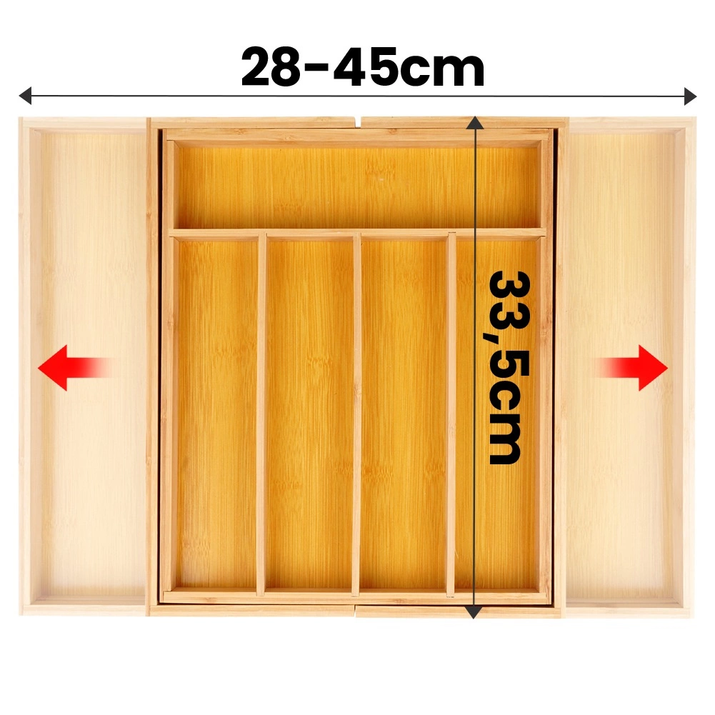 Praktisk bambusorganizer til skuffe med udtrækkelig bredde 35,5–54,5 cm, der holder bestik, knive og køkkenredskaber perfekt organiseret. Takket være 7 gennemtænkte rum får du en overskuelig opdeling og nem adgang. Fremstillet af holdbart bambustræ, som er robust, elegant og let at rengøre. Originalt produkt fra VILDE.