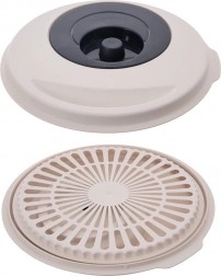 - Plast (transparent skål, grå kurv, hvidt låg med grå elementer)