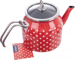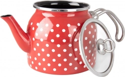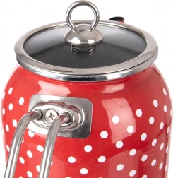 Den emaljerede kande PRIK kombinerer retrolook med moderne funktionalitet. Den røde emalje med hvide prikker suppleres af kant og hank i rustfrit stål, indersiden er i elegant sort. Glaslåget gør det nemt at holde øje med kogningen, og takket være grebet vippes det let ved påfyldning af vand.