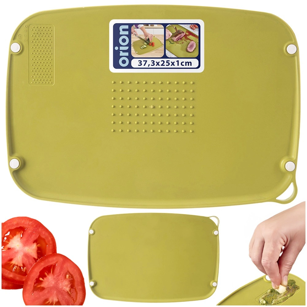 Praktisk og hygiejnisk skærebræt til daglig brug. Tilbyder dobbeltsidet design, skridsikre knopper, centrale pinde til fastgørelse af madvarer og nem afledning af saft i én retning. Tåler opvaskemaskine, varmebestandigt op til +95 °C og har hul til ophæng. Dokumenteret kvalitet fra ORION.