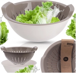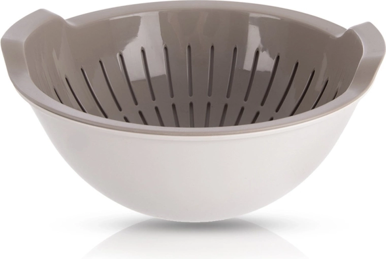 Praktisk sæt sigte + skål 2-i-1 med volumen 3 l, der gør det lettere at skylle og sige frugt, grøntsager og pasta. Den indvendige sigte kan tages ud, skyl råvarerne og sæt den tilbage i skålen, hvor overskydende vand frit kan løbe af. Fremstillet af kvalitetsplast uden BPA, egnet til opvaskemaskine, og skålen kan også bruges i mikrobølgeovnen (op til +95 °C).