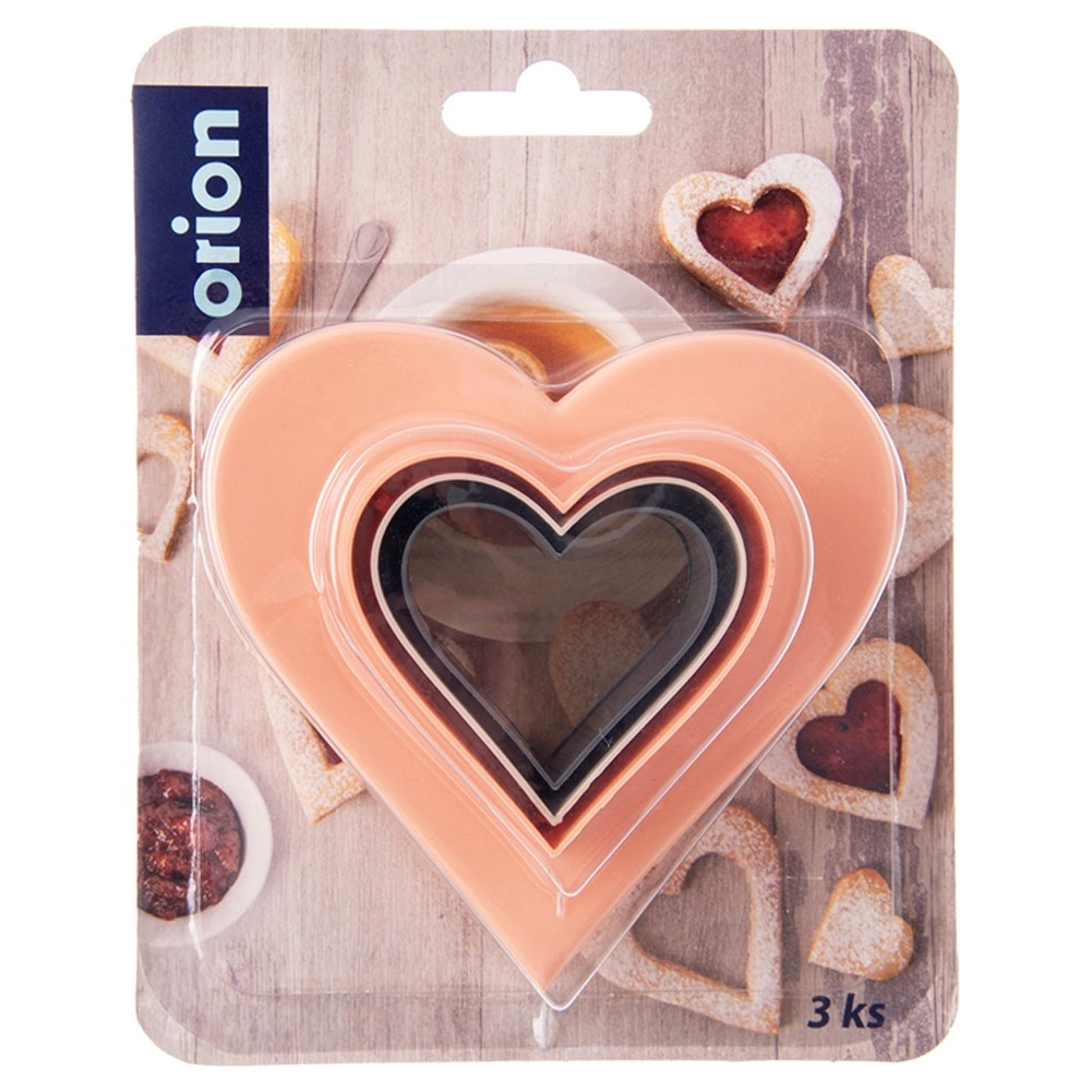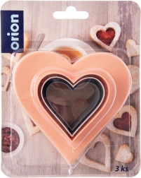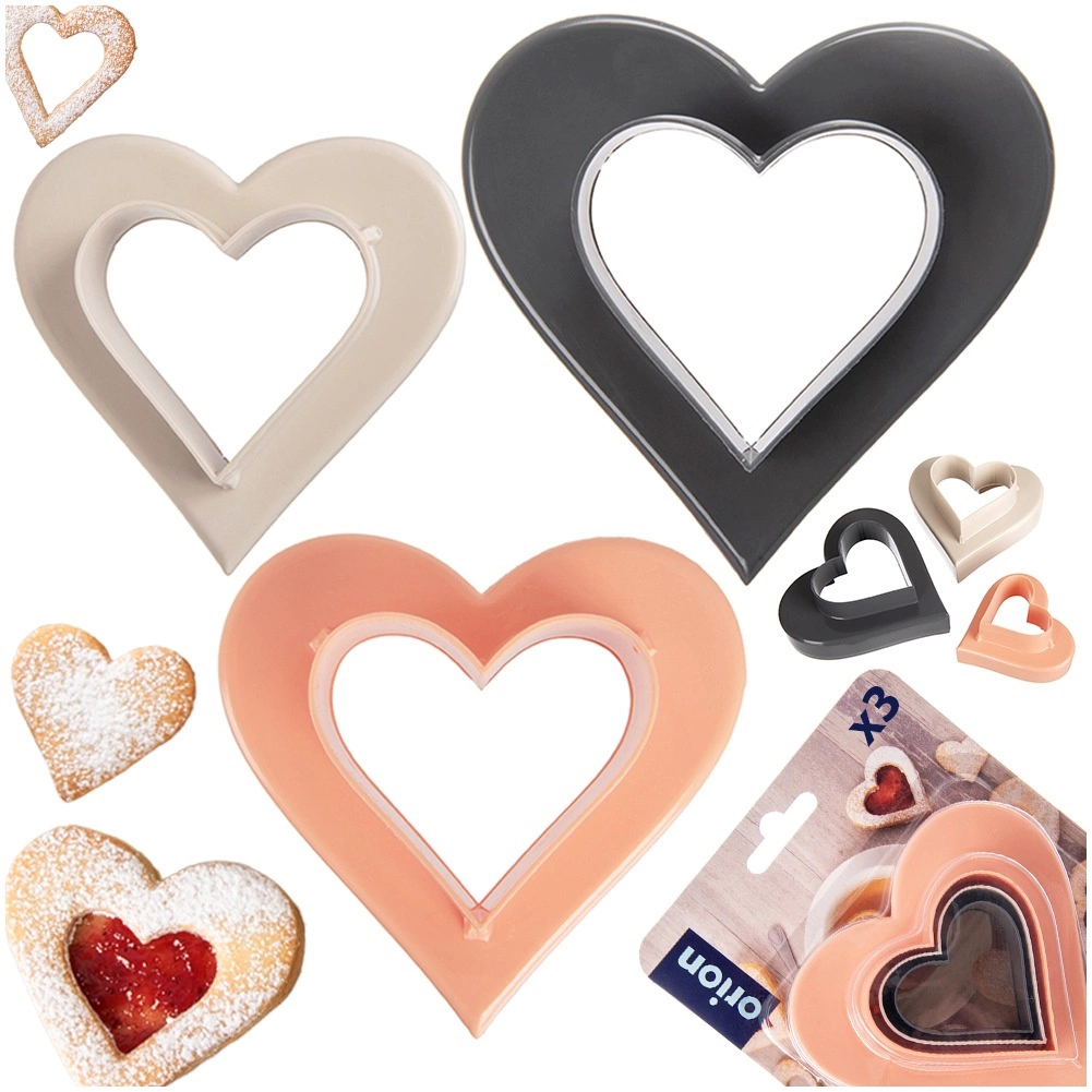 Opdag kreativ bagning med et sæt på 3 dobbeltsidede udstikkere i hjerteform. Hver del har både en ydre og en indre kant, så du nemt laver småkager med marmeladevinduer, lagdelte honningkager eller iøjnefaldende fondantdekorationer. Ideel til hjemmebag og festlige desserter.