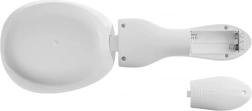 Den aftagelige skål med en volumen på 270 ml er nem at rengøre, og hele enheden er let at opbevare takket være de kompakte mål (sammenlagt ca. 25 × 9 × 5 cm). Strømforsyning via 2× AAA-batterier (medfølger ikke). Automatisk slukning efter 1 minut sparer energi.