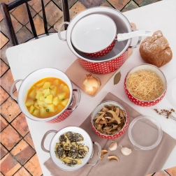 Den universelle bund er kompatibel med gas-, elektriske, glaskeramiske, halogen- og induktionskogeplader, og kasserollen kan også bruges i ovn. Efter madlavning kan du uden bekymringer sætte den i opvaskemaskinen. Naturlige små ujævnheder i emaljen (f.eks. lette forhøjninger eller afvigelser i trykket) er et typisk kendetegn ved traditionel produktion og påvirker ikke kvalitet eller funktion.