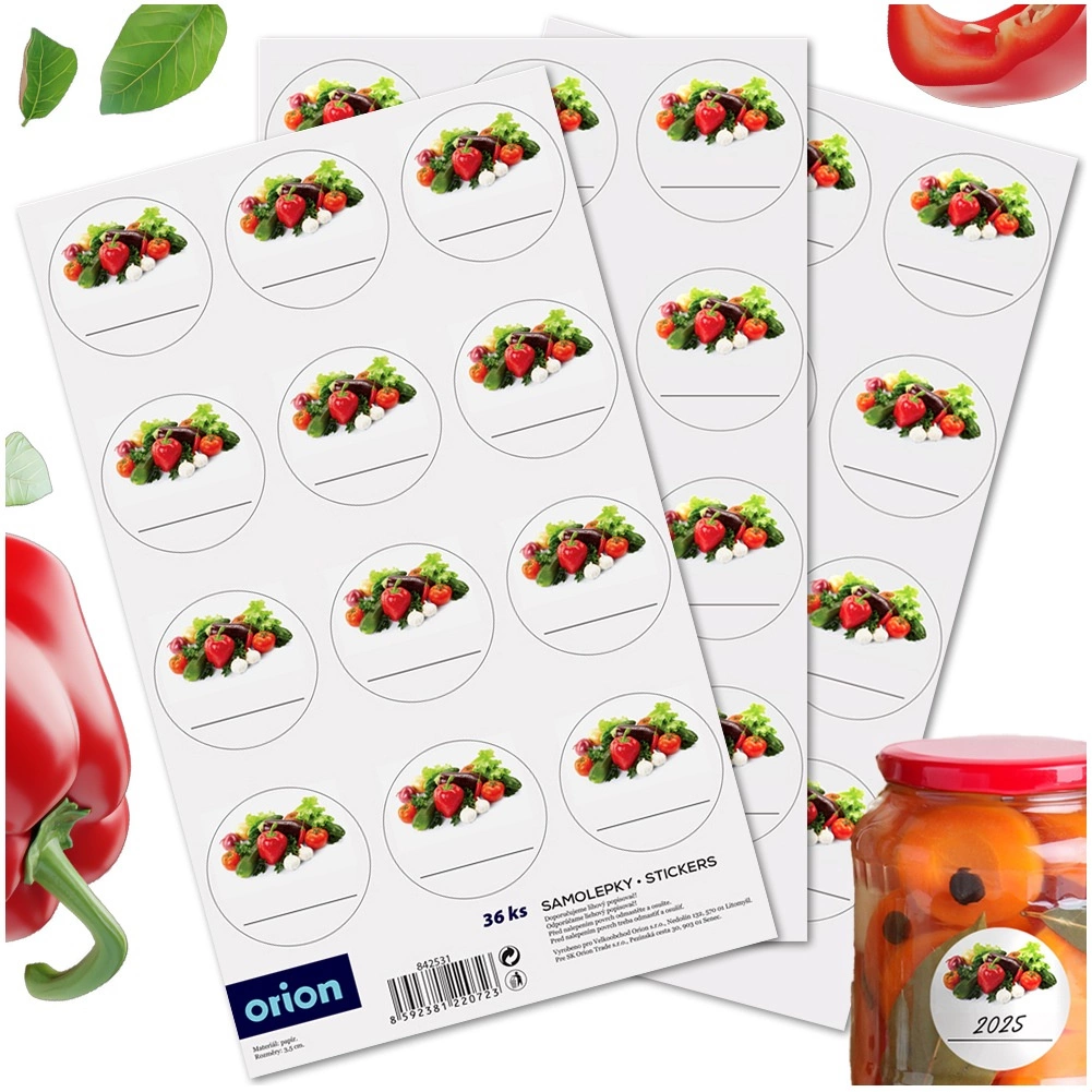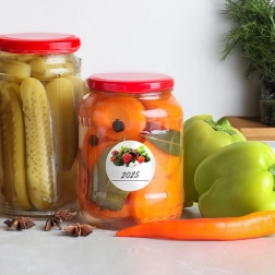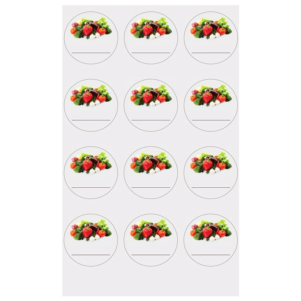 Skab overblik og stil i køkkenet. De runde selvklæbende etiketter med en diameter på 3,5 cm sættes let på glas, flasker og krydderidåser. Den laminerede overflade med grøntsagsmotiv fremhæver det hjemmelavede præg på dine syltninger og urter og beskytter samtidig teksten mod hurtig slitage.