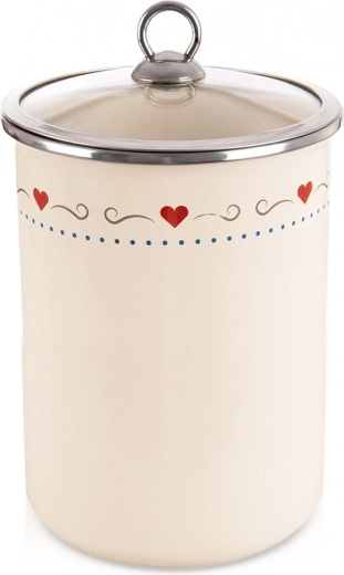 Den praktiske og dekorative krukke i TONCA-serien er fremstillet af kvalitetsemaljeret stål i en cremet nuance med et diskret hjerte-motiv. Glaslåg med kant i rustfrit stål sikrer god tætning og giver samtidig mulighed for straks at se indholdet uden at åbne.