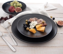 Det minimalistiske design i mat sort løfter både hverdagsservering og festlig borddækning og kan nemt kombineres med anden keramik.