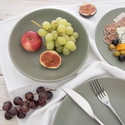 Praktisk og robust dyb tallerken med mål 20,5 × 5 cm, der udmærker sig ved et moderne, minimalistisk design og en behagelig mat overflade. Den grønne nuance matcher let med andet service og skaber en harmonisk borddækning både hjemme og i gastronomien.