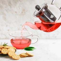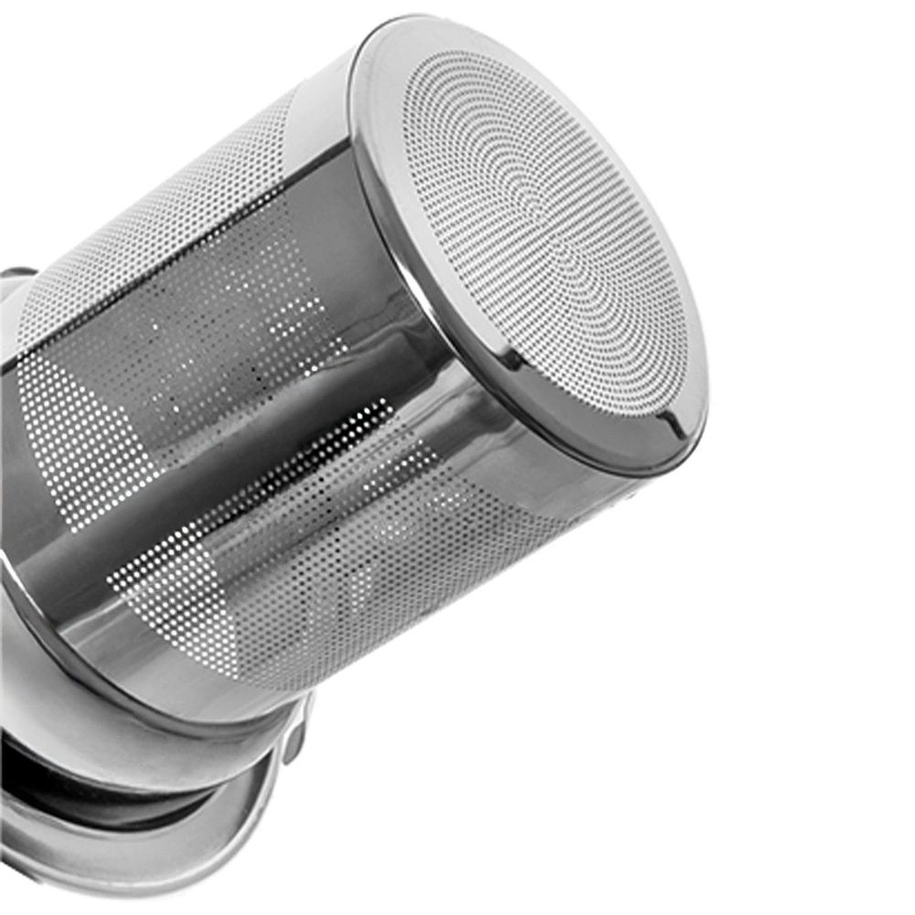 Den integrerede filterindsats i rustfrit stål med fin perforering opfanger selv små blade og gør det let at servere klart uden grums.