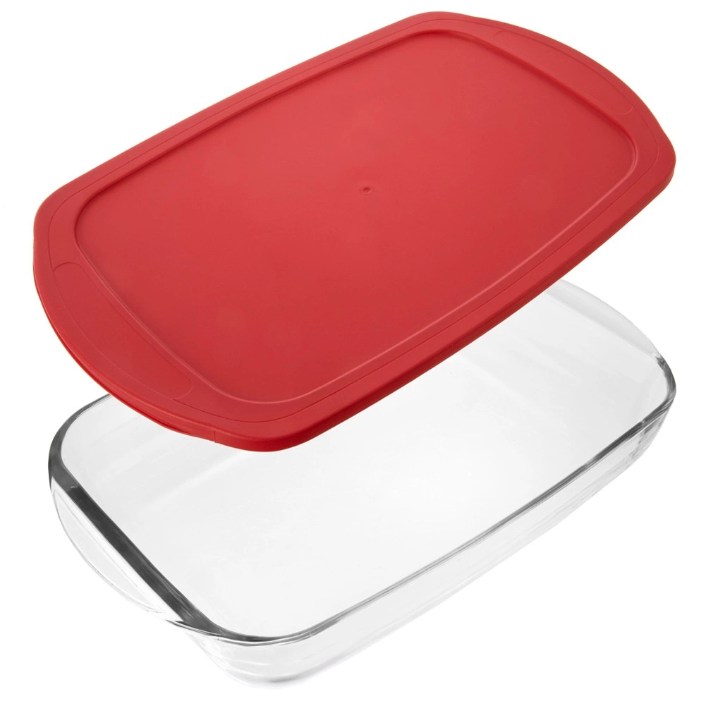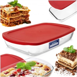 Praktisk glasbagefad med rødt låg og en kapacitet på 3,7 l er ideelt til bagning, gratinering og servering. Fremstillet af borosilikatglas, der tåler temperaturer fra -20 °C til +300 °C, med behagelige håndtag og et lufttæt låg for friskhed og sikker transport. Velegnet til ovn, køleskab, fryser og opvaskemaskine; i mikrobølgeovn må det kun bruges uden låg.