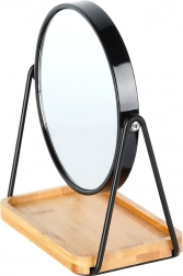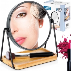 Det tosidede kosmetikspejl med en spejlflade på 15 cm i diameter er ideelt til daglig makeup, brynpleje og detaljeret arbejde. Den stabile metalstander i sort suppleres af en naturlig bambusbase, som samtidig fungerer som en praktisk aflæggebakke til pensler, kosmetiske accessoires eller smykker. Det minimalistiske design i hvid og træ passer let ind i moderne interiører.