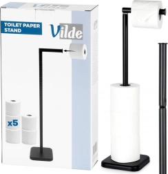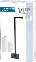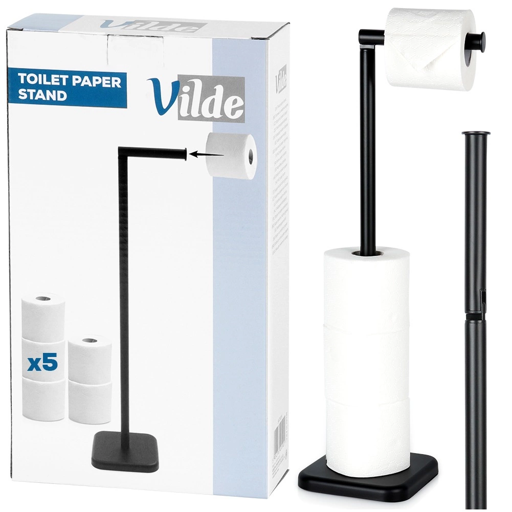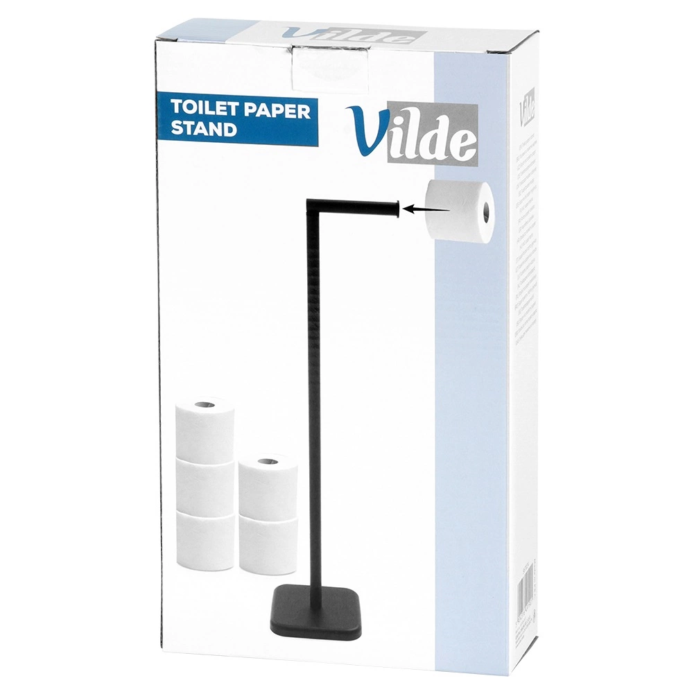 Denne fritstående toiletpapirholder fra VILDE kombinerer et minimalistisk udtryk med maksimal funktionalitet. Den øverste arm gør det nemt at rulle papiret af og kan også stilles lodret, hvilket skaber ekstra plads til en rulle (højden bliver da ca. 69,5 cm). Den robuste konstruktion og den tidløse sorte finish passer til både moderne og klassiske interiører.