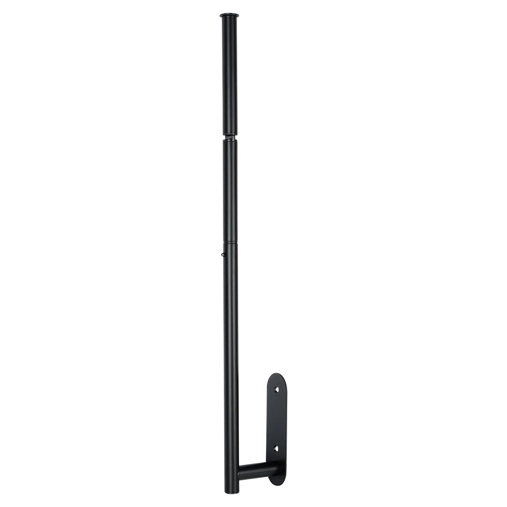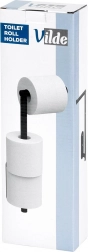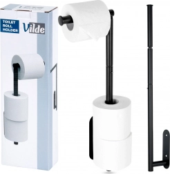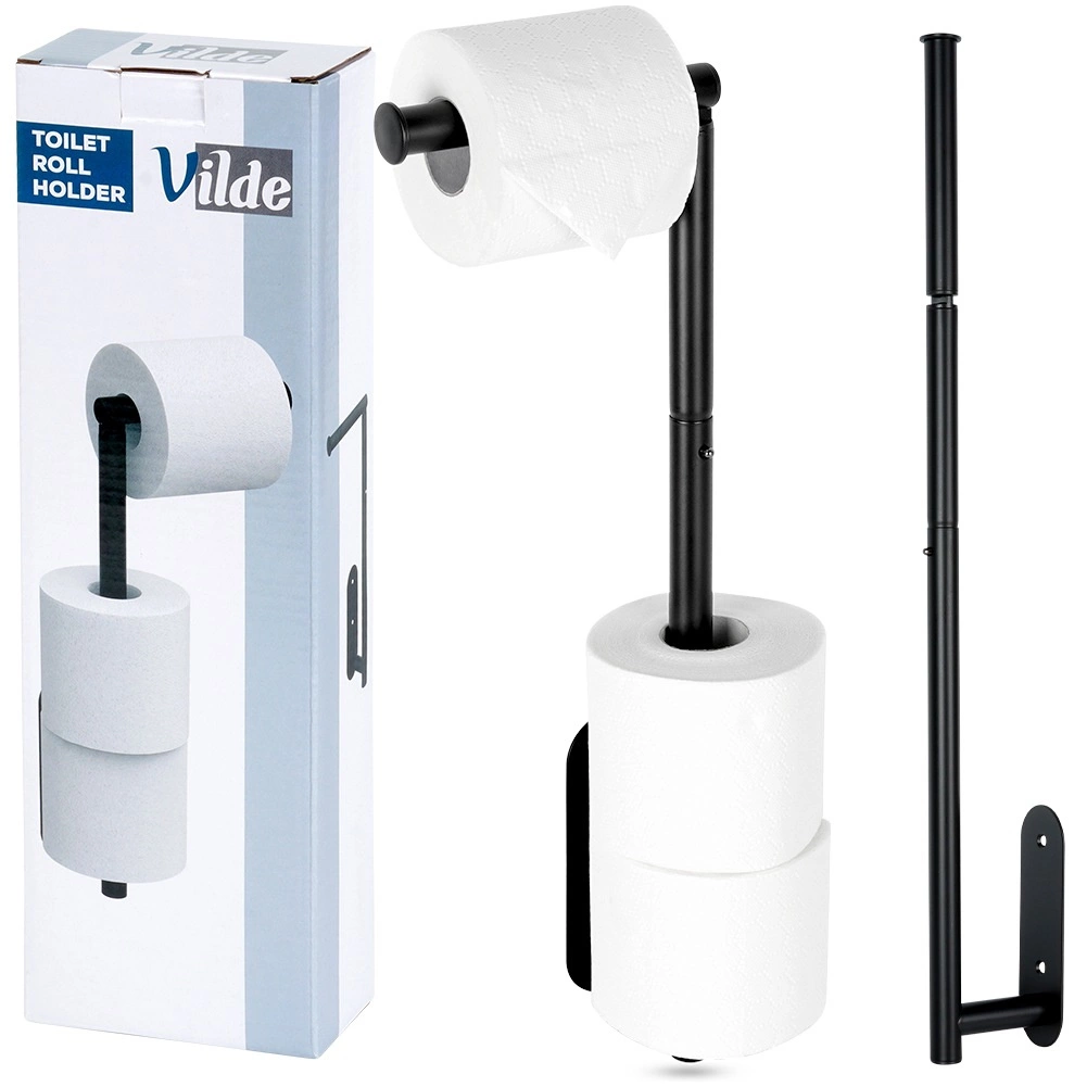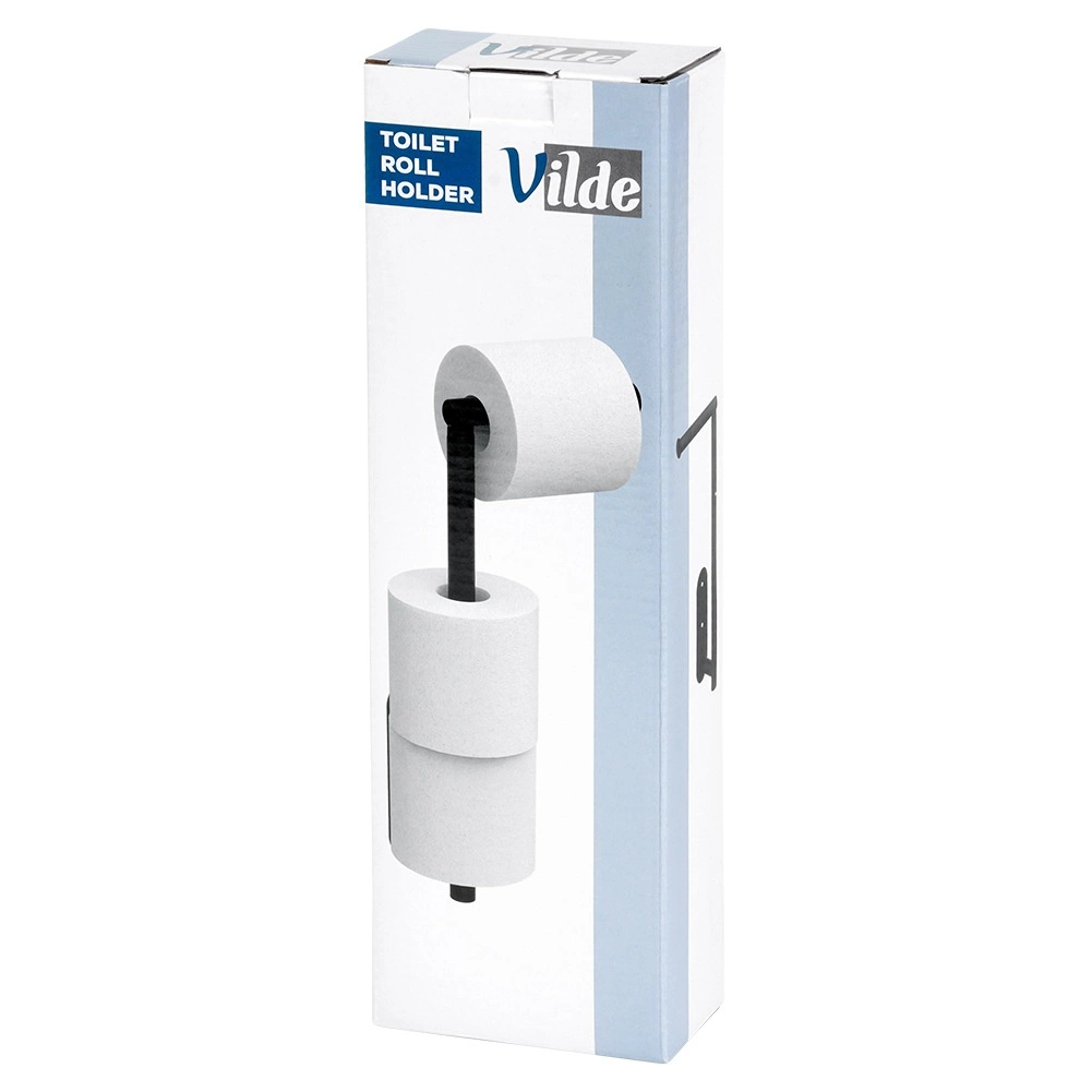 Denne multifunktionelle toiletpapirholder i rustfrit stål med mat sort finish kombinerer dispenser og magasin i ét. Som standard rummer den 1 rulle til øjeblikkelig brug + 4 ekstra (samlet højde 46,5 cm). Takket være den drejelige øverste arm kan den også indstilles som et rent lodret magasin med kapacitet på op til 5 ruller og en højde på ca. 60 cm.