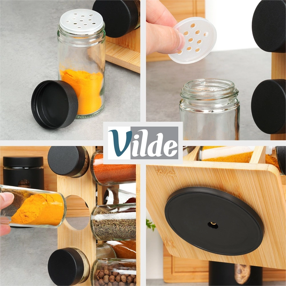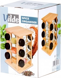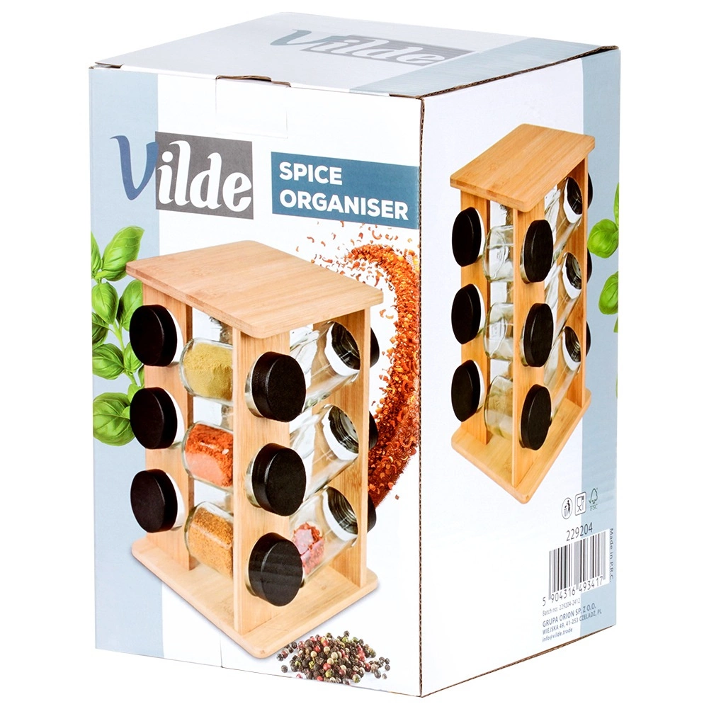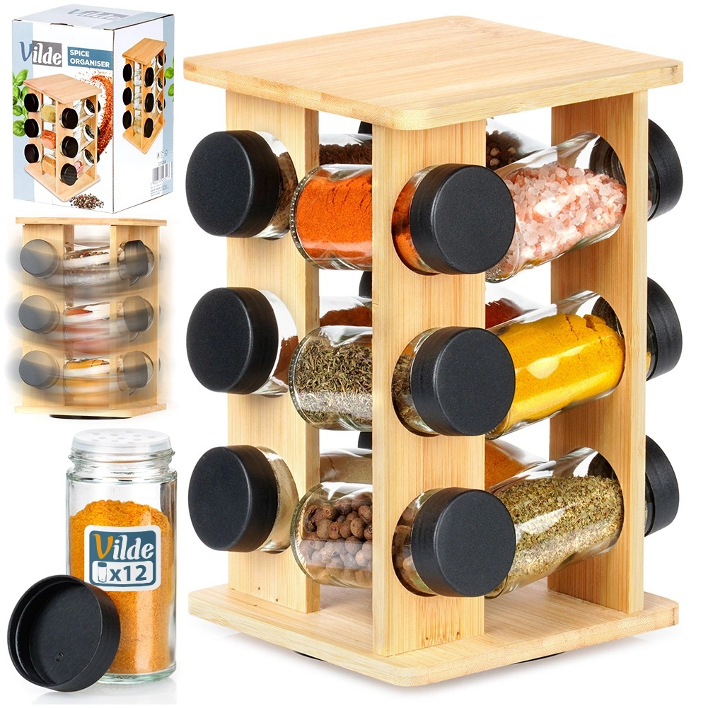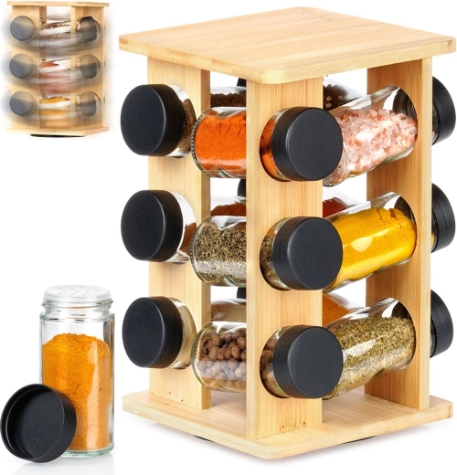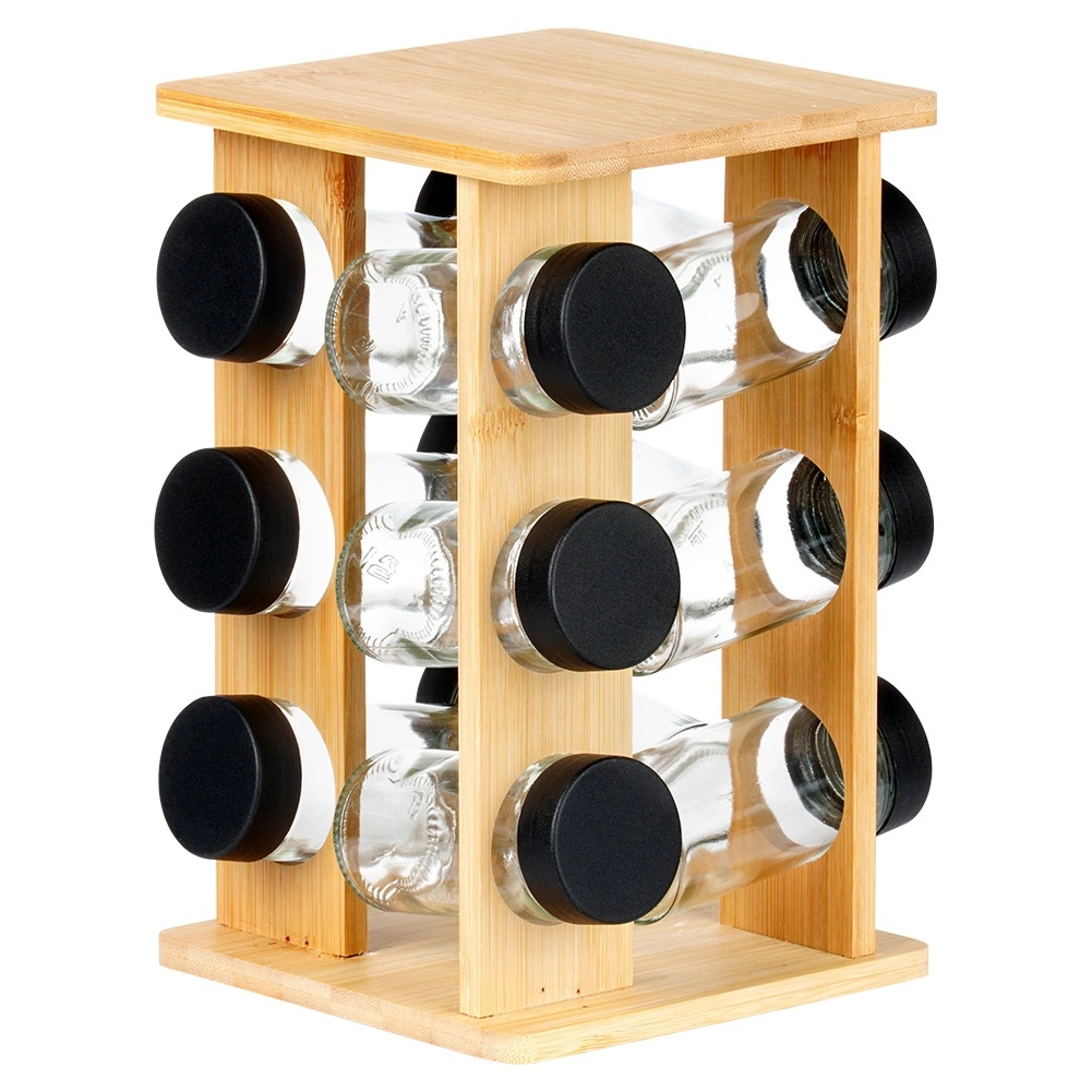 Hold dine krydderier inden for rækkevidde og i perfekt orden. Det drejelige stativ af naturligt bambustræ rummer 12 glas-krydderibeholdere med sorte skruelåg og hvide dosersi til nem dosering. Takket være den drejelige mekanisme finder du hurtigt den ønskede ingrediens, mens den kompakte, vertikale konstruktion sparer plads på både bordplade og i skab.