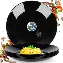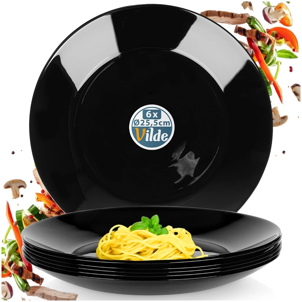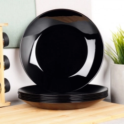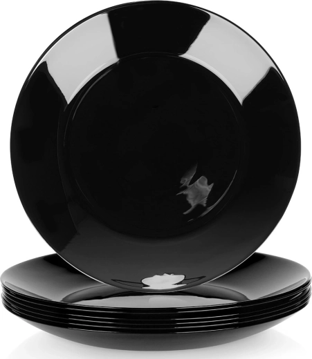 Sæt med 6 alsidige flade tallerkener i kvalitets-opalglas med elegant sort glans. Takket være det tidløse udtryk og den robuste udførelse fuldender de dit bordudstyr – fra hverdagsfrokost til festmiddag. Materialet minder om porcelæn, men er nemt at vedligeholde og langtidsholdbart.