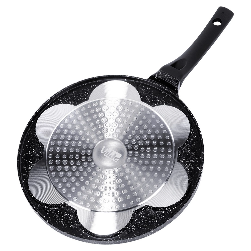 Den flerlagede bund leder varmen effektivt over hele pandens overflade, forkorter tilberedningstiden og sikrer ensartet gennemstegning.