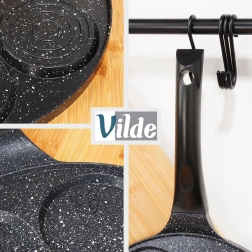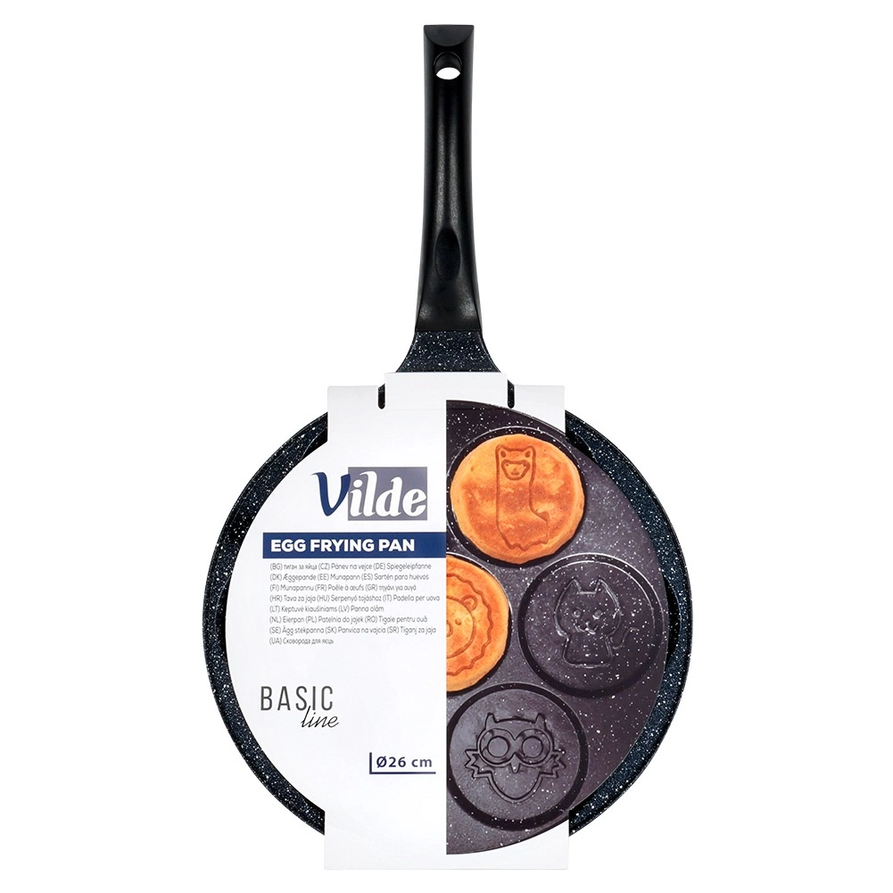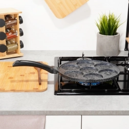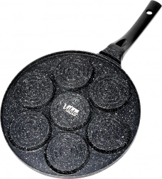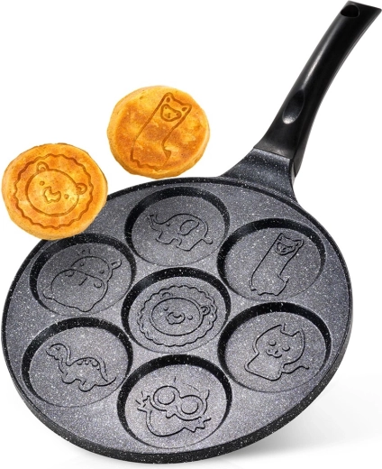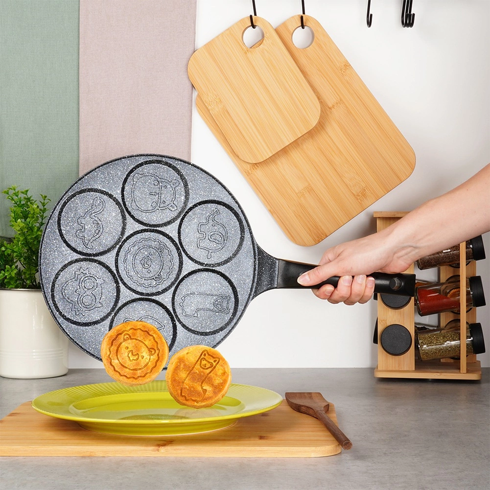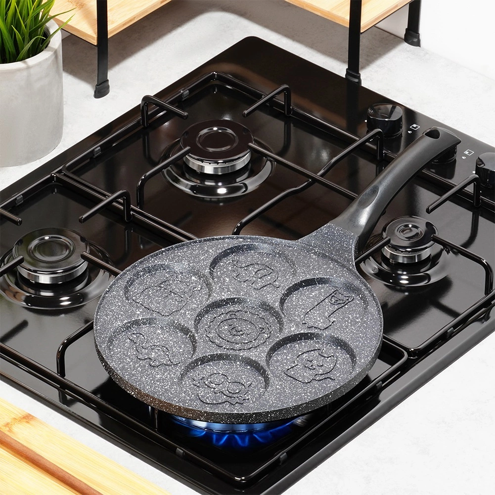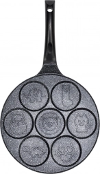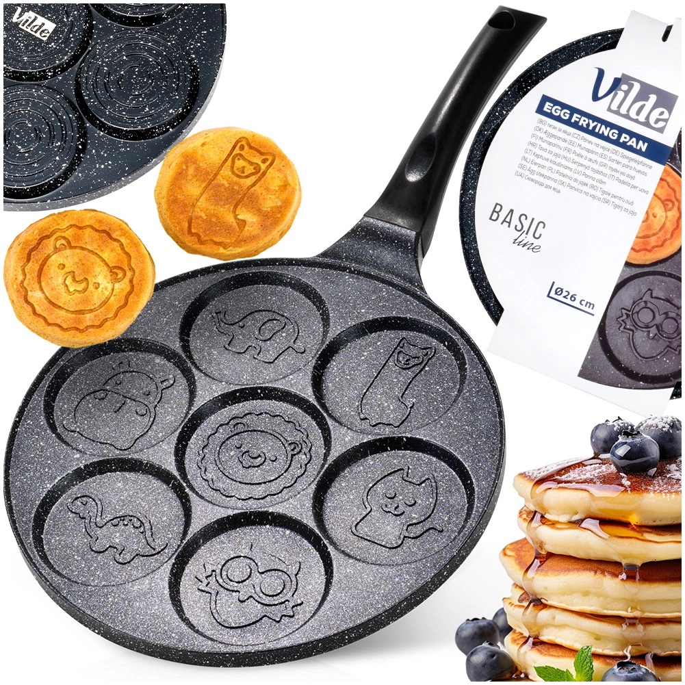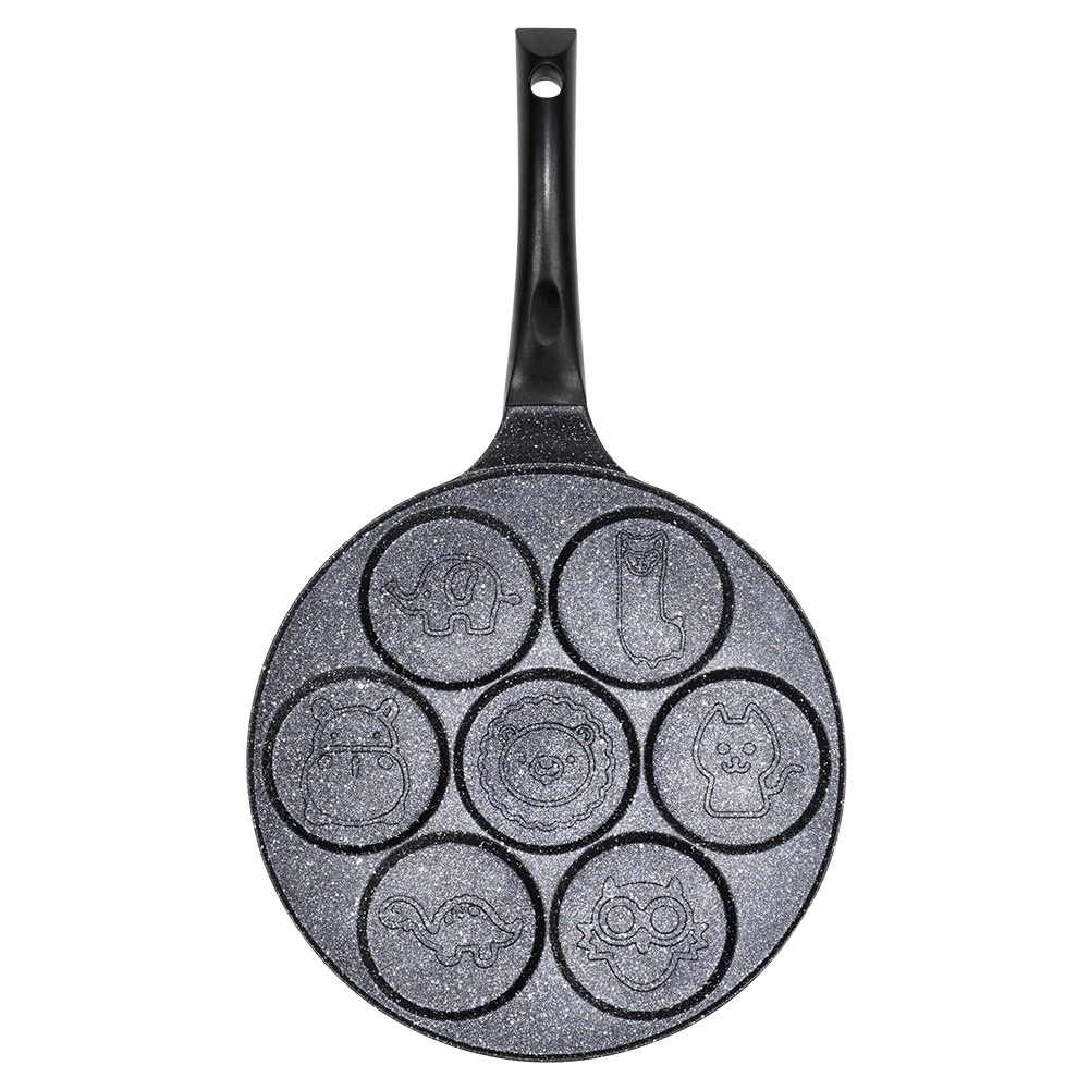 Denne stilfulde pande med syv forme er ideel til tilberedning af æg, pandekager og mini-pancakes med glade dyre-relieffer. Den non-stick granitoverflade sikrer let frigivelse af maden og enkel rengøring, mens aluminiumskroppen giver hurtig og jævn varmefordeling.