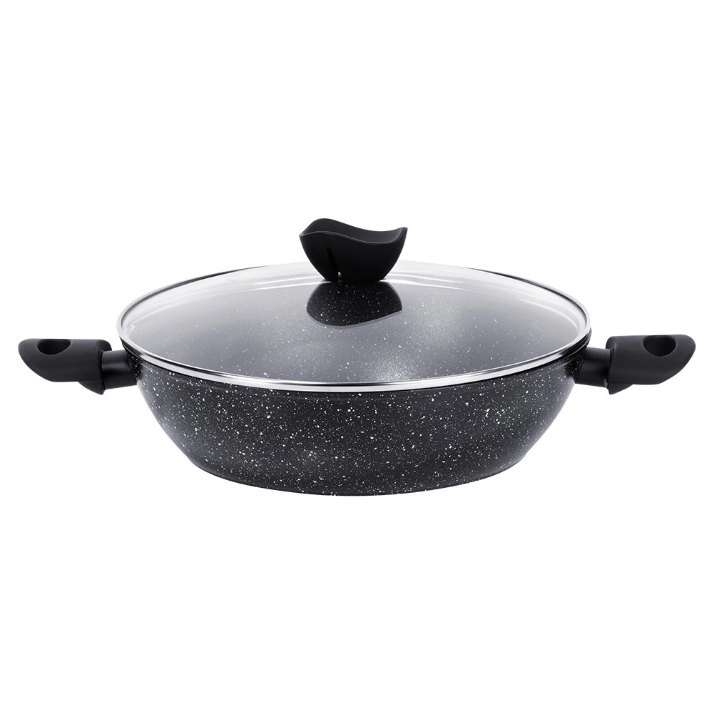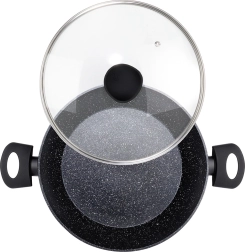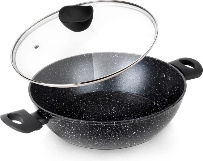 Praktisk og holdbar dyb pande med glaslåg, 28 cm i diameter og 3,5 l volumen, til daglig madlavning, stegning og simring. Takket være den non-stick granitbelægning kan du lave mad med minimalt fedt, den jævne varmefordeling sparer energi, og universel bund til alle komfurtyper inklusive induktion sikrer bred anvendelse. Bløde Soft Touch-håndtag er behagelige og varmebestandige, og panden er egnet til opvaskemaskine.
