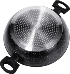 Den dybe pande BLACK LINE kombinerer moderne design og daglig funktionalitet. Den robuste aluminiumskrop med non-stick granitbelægning gør sund madlavning nemmere og minimerer fastbrænding. Det gennemsigtige glaslåg med dampventil giver dig fuld kontrol over tilberedningen og bevarer saftigheden i retterne.