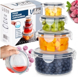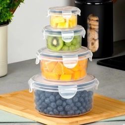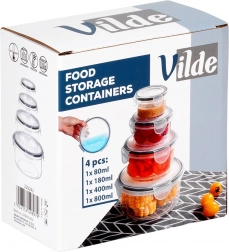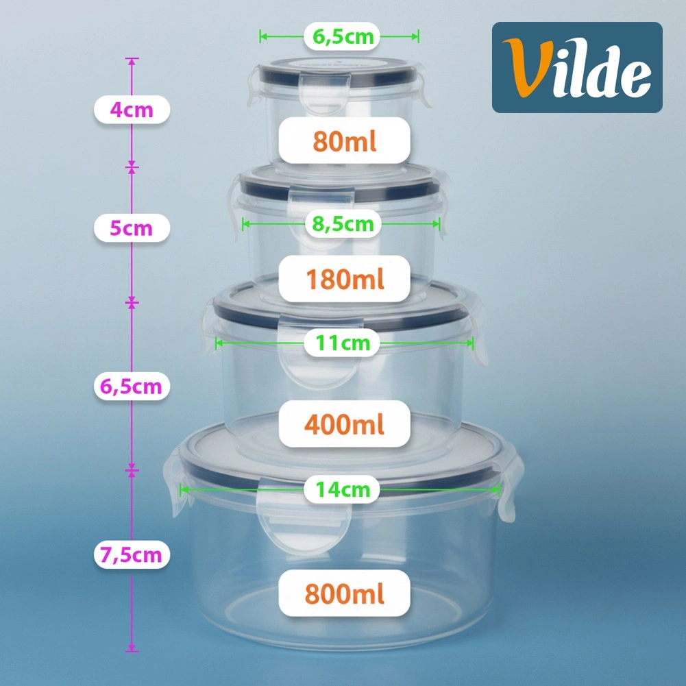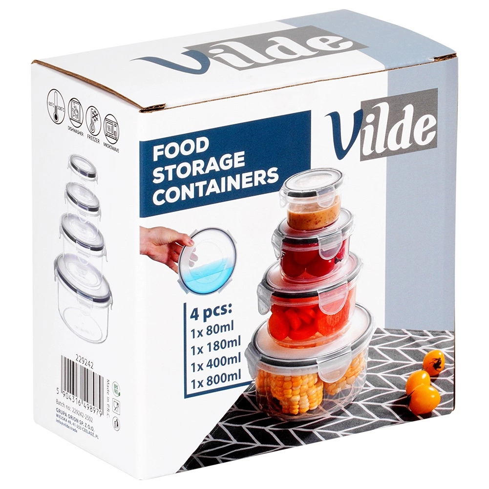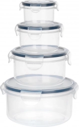 Fire runde beholdere (800/400/180/80 ml) kan stables i hinanden og sparer plads i skuffer og spisekammer.